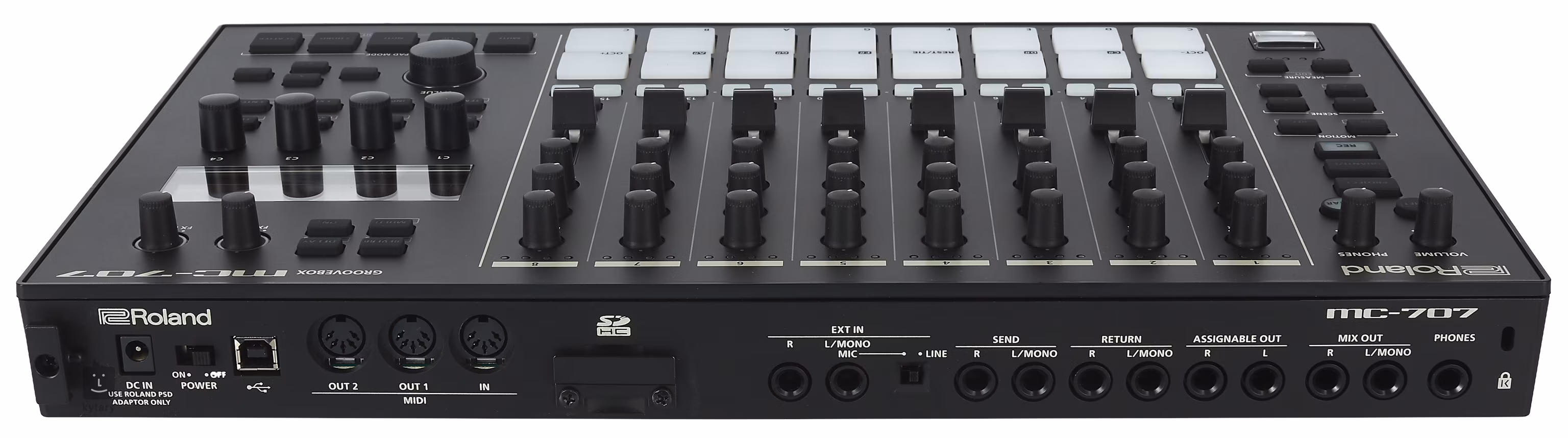 Fyzický zážitek. MC-707 a jeho armáda ovladačů vám dovoluje ponořit se do hudby a fyzicky ji tvarovat do hloubky. S fadery pro každou stopu můžete okamžitě mixovat a organizovat jednotlivé linie a ovladačům můžete snadno přiřadit jakoukoli potřebnou funkci. Pohyby ovladače dokonce lze i zaznamenat, takže se automaticky přehrají. A uspořádání padů 8x2 je skvělé nejen pro bicí – zadat můžete i melodie a akordy i s tempem a spouštět i audio a MIDI klipy.