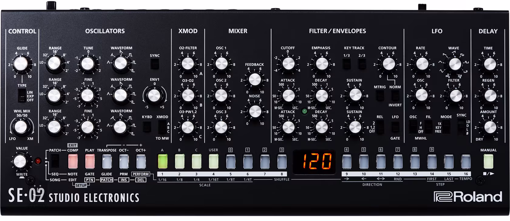 Kromě vintage charakteristiky zvuku však Roland SE-02 nabízí i moderní prvky jako tři typy cross modulace, feedback smyčku filtru, synchronizované LFO s devíti typy vlny, obracení obálky, synchronizaci oscilátorů, generátor šumu a synchronizovaný delay.