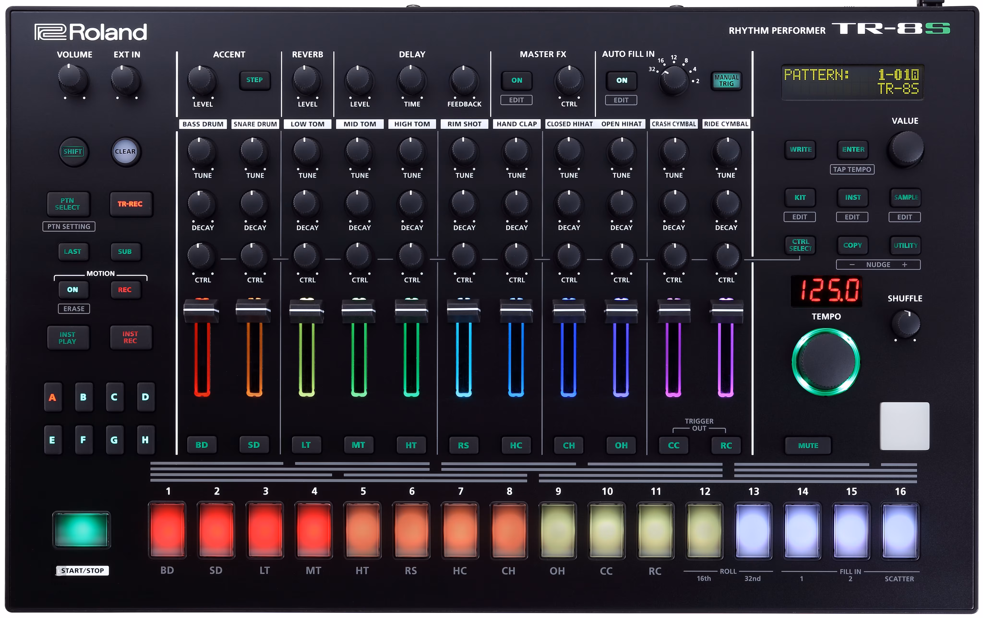 Groovebox Roland TR-8S nabízí nejžádanější zvuky populárních automatických bubeníků Roland – TR-808, TR-606, TR-909, TR-707, TR-727. Ty jsou díky technologii ACB k nerozeznání od originálů, nyní si je však můžete užít se všemi moderními vymoženostmi – na palubě je například pokročilý sekvencér, sampler, digitální efekty, parameter locks nebo variace a breaky.