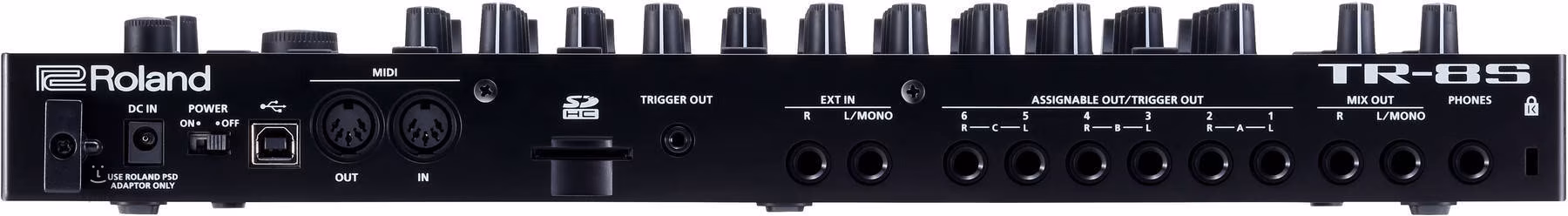 Konektivita a zvuková karta Na zadním panelu se nachází osm analogových výstupů pro jednotlivé bicí, které jsou volně přiřaditelné jednotlivým nástrojům nebo skupinám zvuků. Výstupy se také dají nastavit jako triggery, spolu s celkovým Trigger výstupem, USB a MIDI tak TR-8S umožňuje snadnou integraci do všech možných systémů. Nechybí ani stereo vstup pro externí zdroj audia nebo zabudovaná zvuková karta s rozlišením 24bit/96kHz. TR-8S tak bude doma při živém hraní i ve studiu.