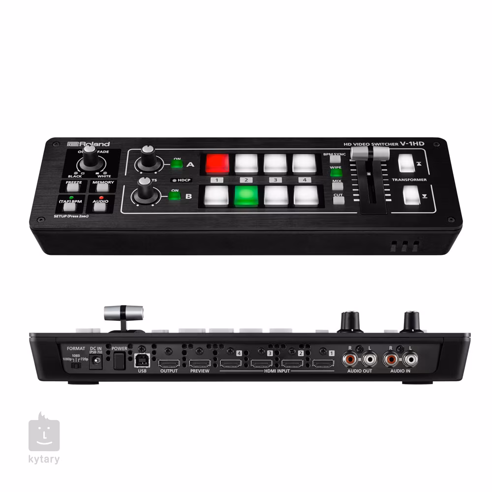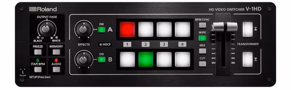 V-1HD disponuje robustní faderem a přehledným intuitivním ovládacím panelem, díky němuž snadno nastavíte jednotlivé přechody mezi záběry, aplikujete na snímek efekty nebo s jeho pomocí kontrolujete kompatibilní software. Zařízení disponuje také flexibilní konektivitou v podobě čtyř HDMI vstupů, dvou HDMI výstupů, stereo RCA In/Out a USB portu. Boční strana také obsahuje sluchátkový výstup s vlastním ovladačem hlasitosti a vstup pro mikrofon s ovladačem Gain.