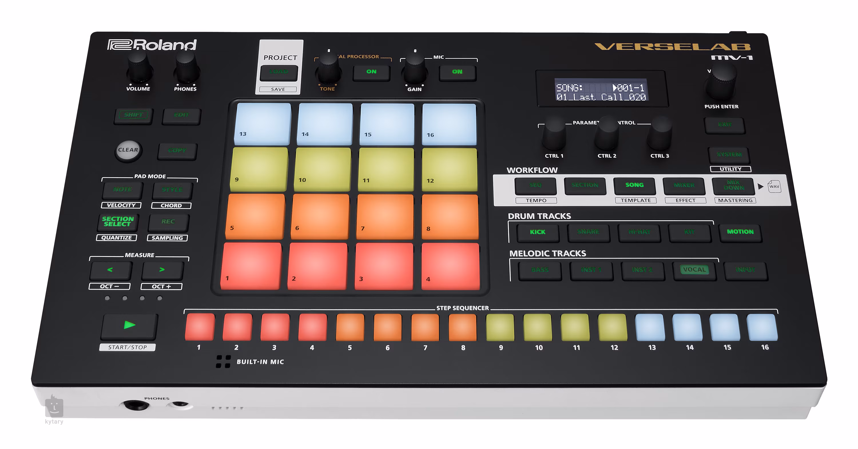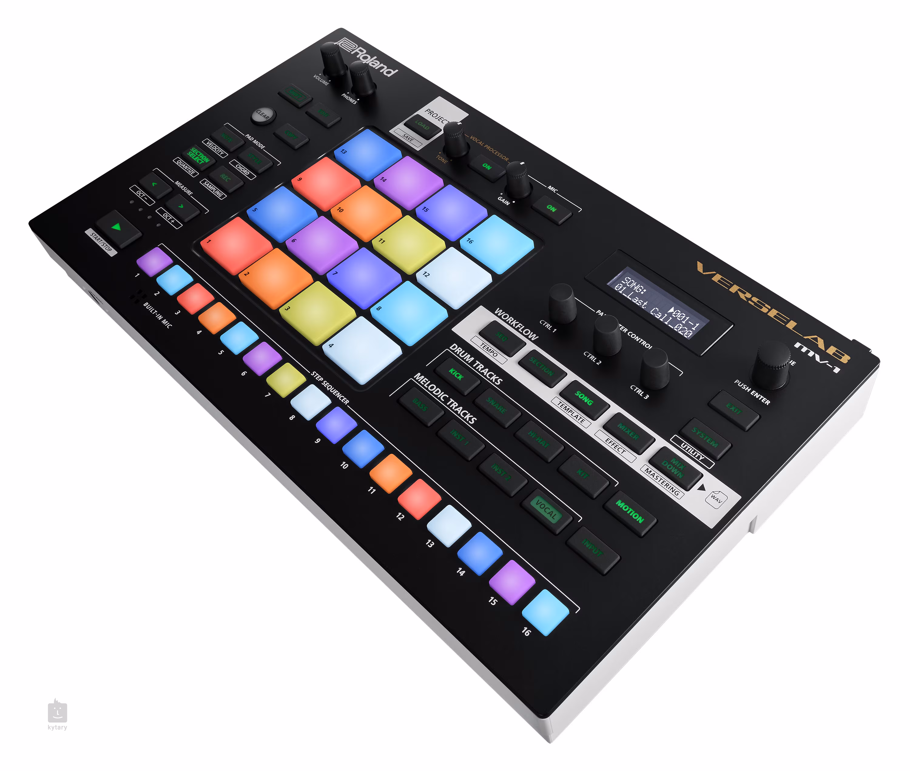 Verselab MV-1 je vysoce výkonná produkční stanice od Roland, která vám připraví ideální prostředí pro nahrávání, produkci, mix a mastering vašich nových songů nebo nápadů. Vaše mysl a kreativita dostanou volný průběh, k dispozici vám navíc bude až tři tisíce zvuků z aplikace ZEN-Core. Verselab MV-1 je plně kompatibilní s PC, laptopem, tabletem, nebo vašim smartphonem, bude to zkrátka skvělý společník na cesty. Kafe nevařím, ale jinak makám jako šroub… Tahle mašinka obstará opravdu všechno, můžete tvořit nové stopy, samply, mixovat nahrávky a aplikovat různé moderní efekty studiové kvality, jako např.: Auto-Pitch, Harmonizer a Doubler. K dispozici budete mít 16 podsvícených padů a 16krokový sekvencér pro tvorbu beatů, basových linek a melodií. Nástroje pro Songwriting vás potom hodí do té správné flow a vytvoří vám ideální podmínky pro kreativní tvoření. Verselab MV-1 lze napájet prostřednictvím AC adaptéru (součástí balení), mobilní baterie nebo USB portu. Co na mě najdete? Kromě intuitivního ovládacího panelu obsahuje Verselab MV-1 také integrovaný mikrofon a přehledný textový displej pro detailní nastavení zvuků, nebo vyvolání továrních či uživatelských presetů. Maximální komfort vám potom zajistí flexibilní konektivita v podobě dvou sluchátkových výstupů pro detailní monitoring, stereo výstupu pro připojení do studiových monitorů nebo PA, XLR vstupu s fantomovým napájením pro kondenzátorové mikrofony, nebo dvou linkových vstupů. Digitální přenos potom probíhá prostřednictvím MIDI In/Out konektivity a USB portu. Vaše nahrávky si ukládáte na SD/SDHC paměťovou kartu (součástní balení) se slotem na zadní straně zařízení.