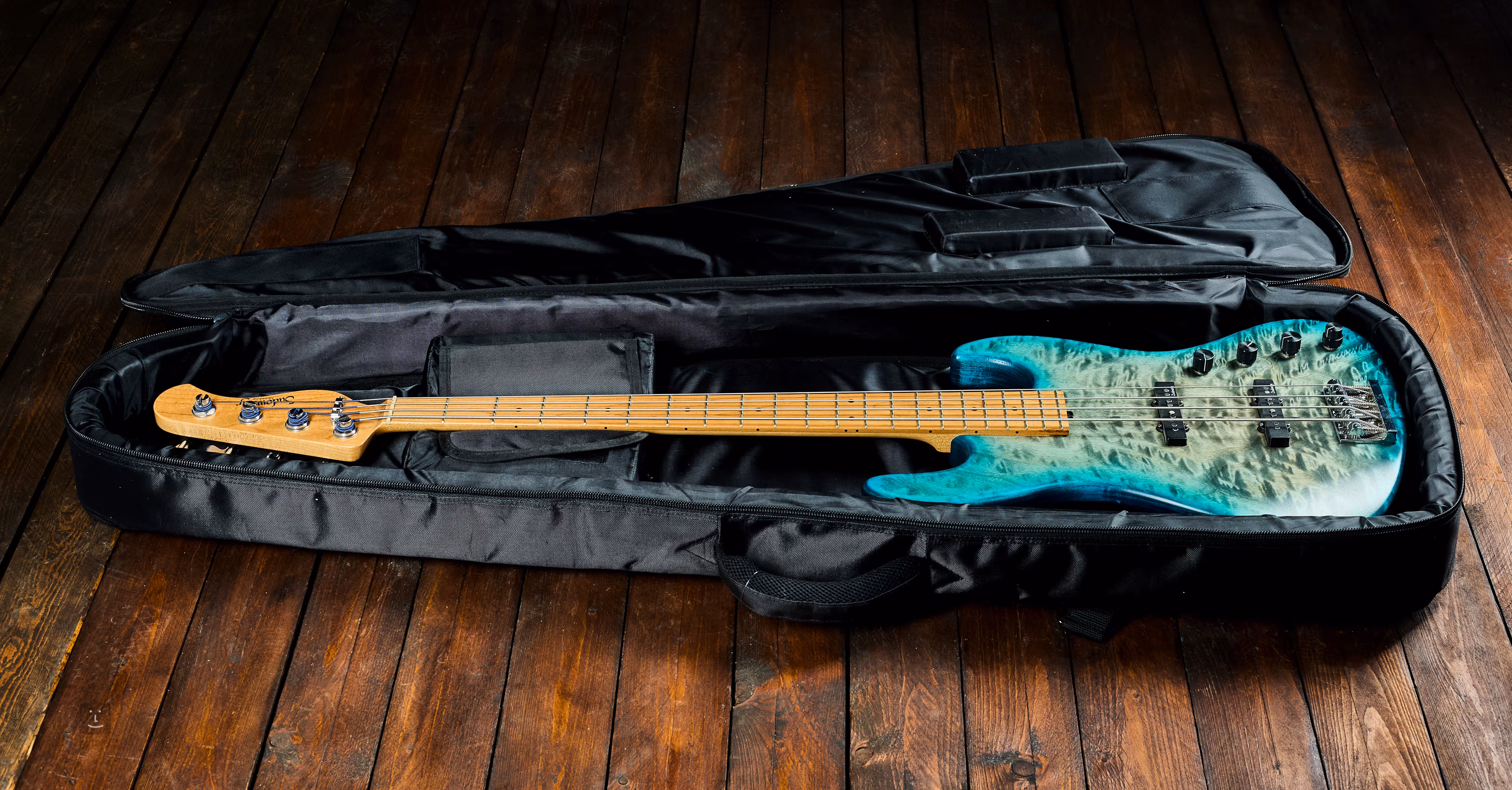 Sadowsky Metro Line vyrobený v Německu v roce 2020 v rámci limitované edice ve speciálním transparentním barevném provedení, pod kterým vyniká javorový obláčkový "Quilted Maple" top. Bylo vyrobeno pouze 100 kusů celosvětově ve 4- i 5-strunných verzích.
