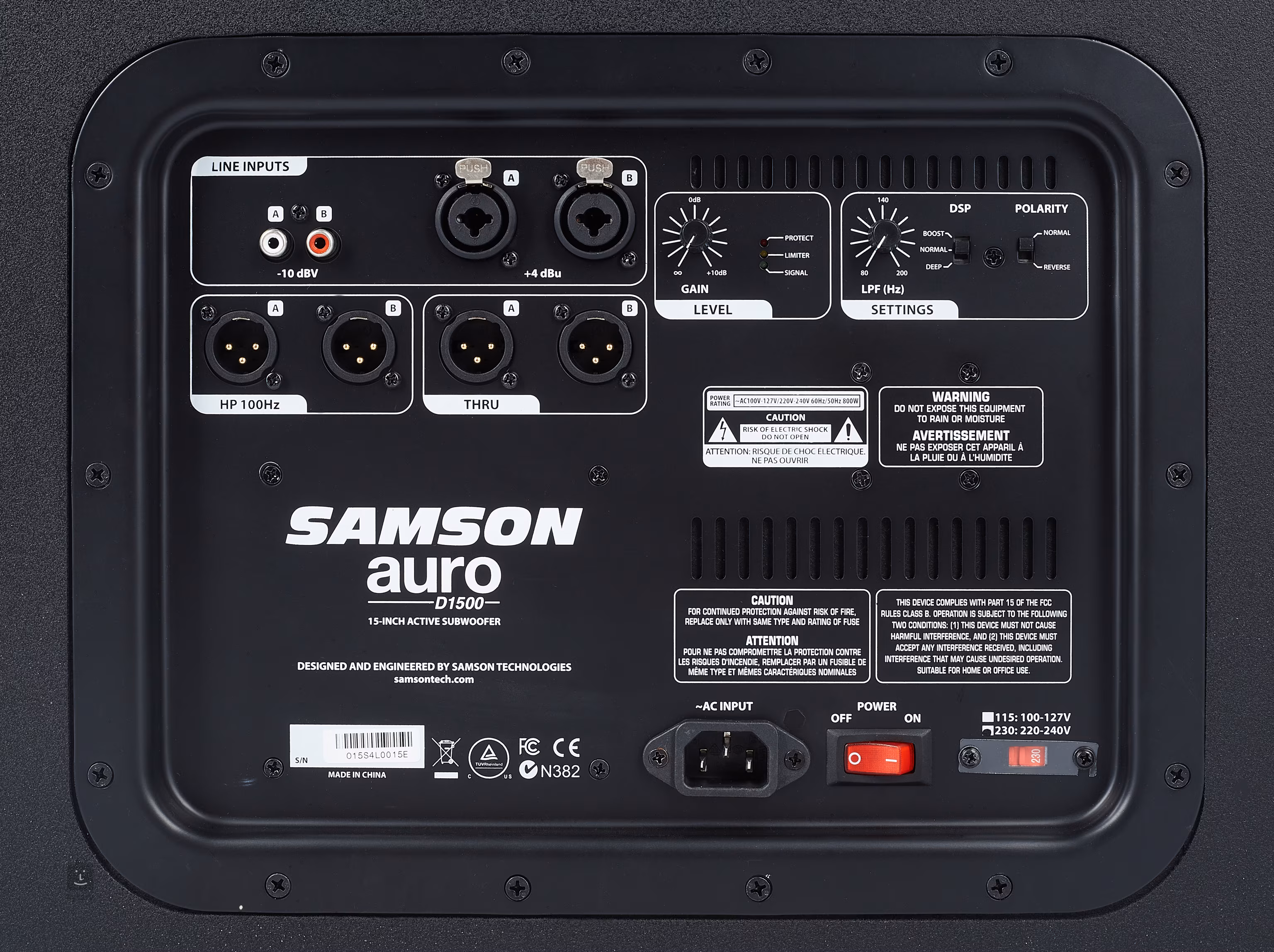 Samson Auro D1500 je aktivní subwoofer vhodný pro ozvučení diskoték, komorních koncertů nebo venkovních akcí. Dřevěná konstrukce se strukturovanou povrchovou úpravou je odolná vůči dešti nebo škrábancům způsobeným nešetrnou manipulací při transportu.
