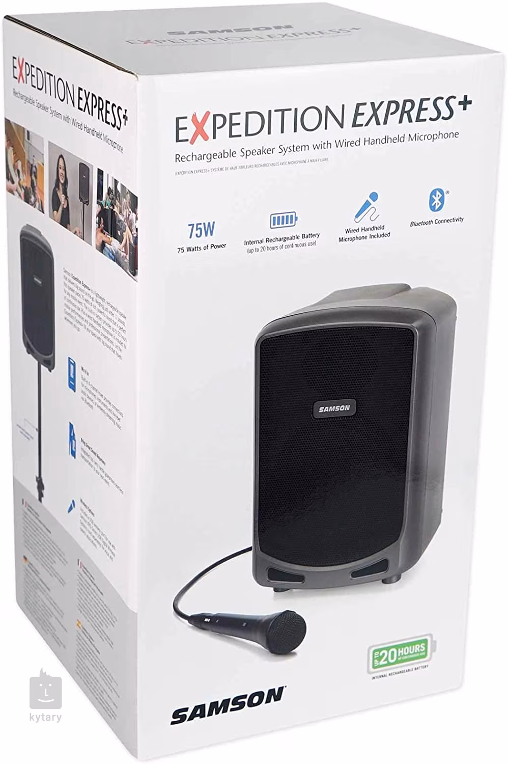 Nenechte se zmást kompaktními rozměry nového boxu Samson Expedition Express+. Se svým výkonem 75W dokáže hravě ozvučit produkci až pro 100 posluchačů. Tento lehký All-In-One box s vestavěnou dobíjecí baterií navíc váží pouhých 5.4 kg, takže ho pohodlně přenesete na místo produkce. Díky 6" basovému reproduktoru a 1" tweeteru Vás překvapí bohatým a plným zvukem. Pokud máte svoje oblíbené skladby uložené v mobilním telefonu, snadno je přehrajete díky integrované technologii Bluetooth, aniž byste museli zařízení propojovat kabely. Samson Expedition Express+ je osazen dobíjecí lithiovou baterií, která poskutuje až 20 hodin provozu, takže je dokonale mobilní. Celý set je navíc doplněn přibaleným dynamickým mikrofonem s kabelem.