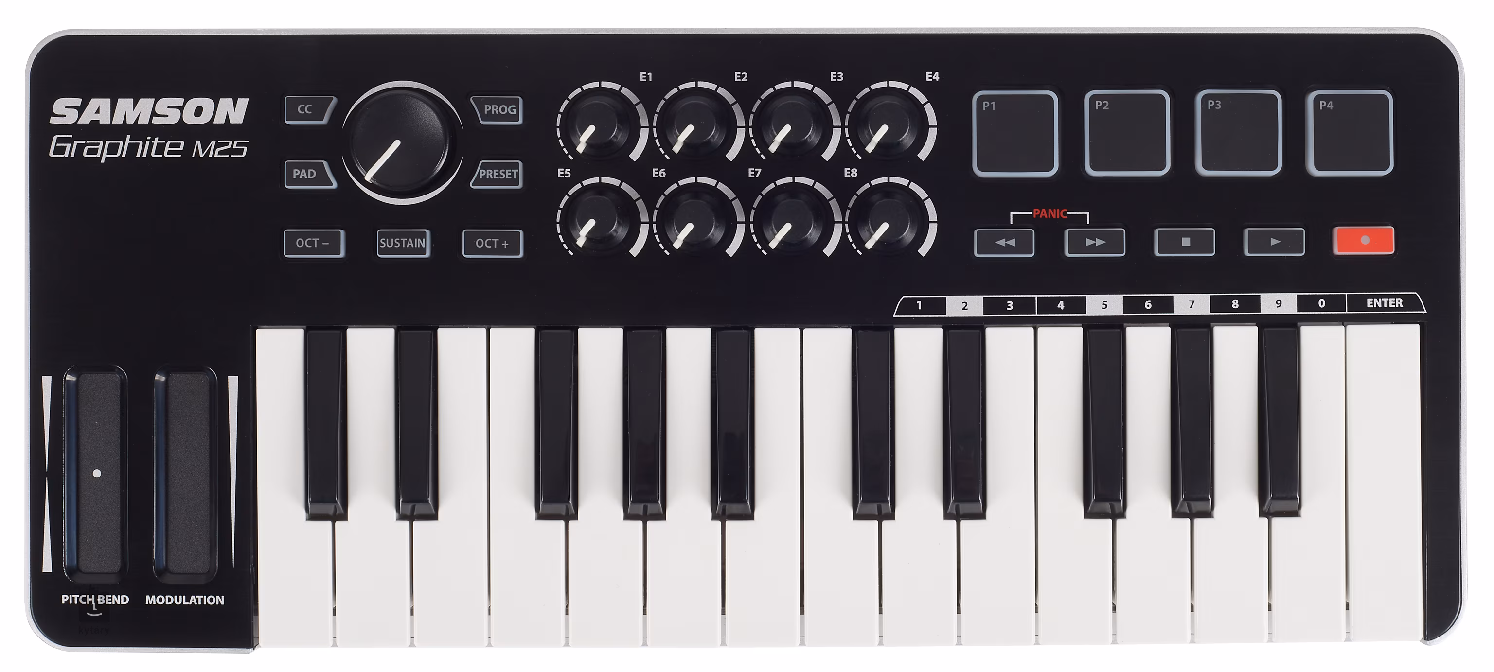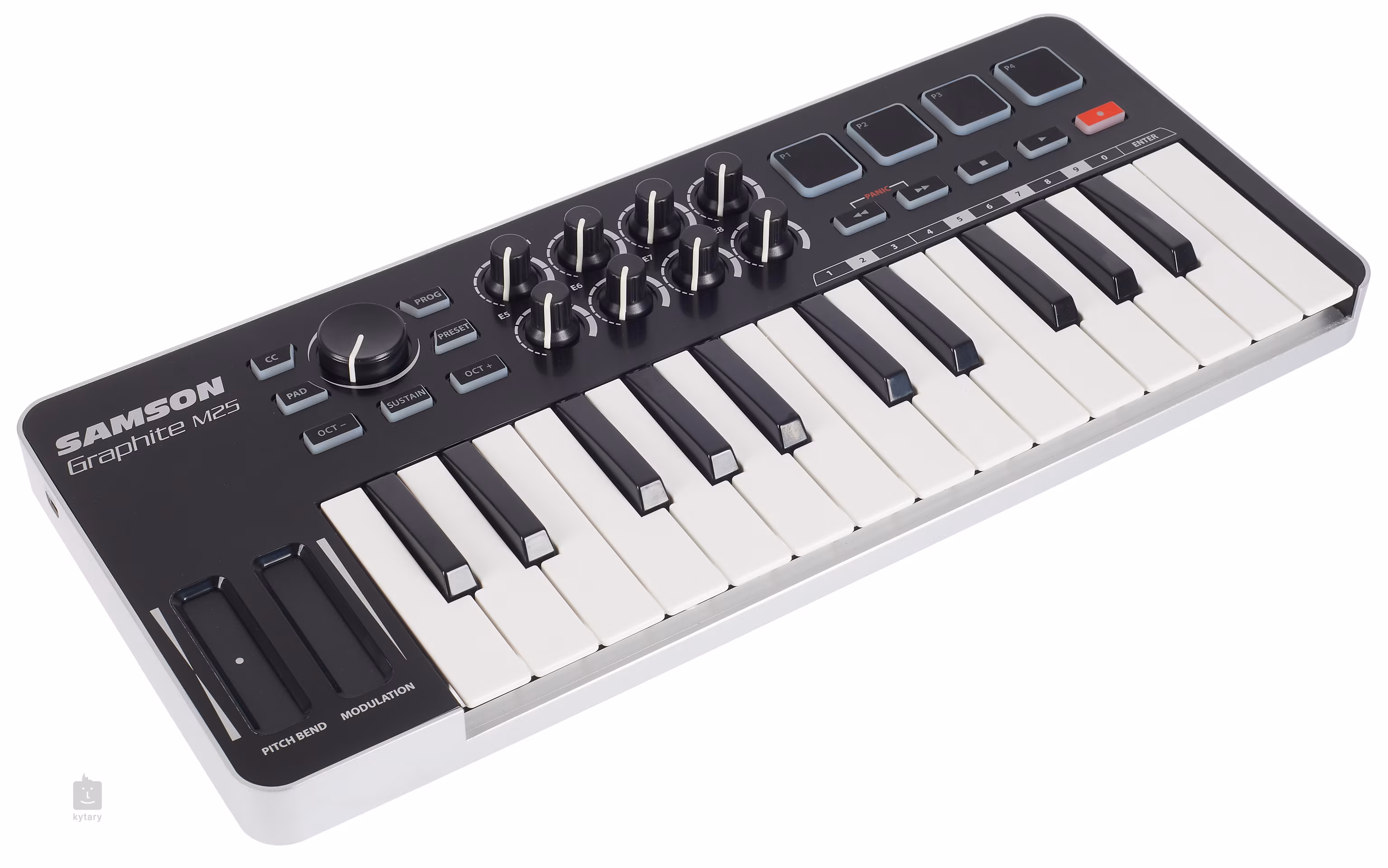 Univerzální MIDI kontrolér s 25 mini klávesami vhodný pro hudební producenty, muzikanty a tvůrce AV materiálu. Ovládací panel vám nabídne dotykový pásek Pitch Band a Modulation, osm knobů pro nastavení parametrů, programovatelný master encoder, ovladače pro transponování a čtyři podsvícené pady o. Zadní panel potom disponuje flexibilní konektivitou v podobě vstupu pro Sustain pedál a MIDI Out. Součástí balení je USB kabel.
