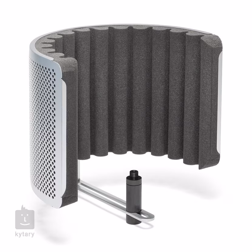 Mikrofonní odrazová clona. Tato clona umožní vytvořit ideální prostředí pro nahrávání hlasu i v podmínkách domácího studia, kde nejsou dodrženy ideální akustické standardy. Jednolitá konstrukce je vyrobena z perforovaného hliníku, vnitřní část potom tvoří kvalitní akustická pěna splňující průmyslové standardy. Součástí balení je držák na mikrofonní stojan, kterým lze pohybovat v rozmezí 22cm, zástěnou potom můžete v držáku pohybovat vertikálně až o 16cm.