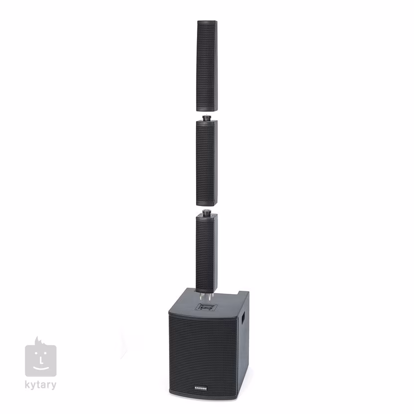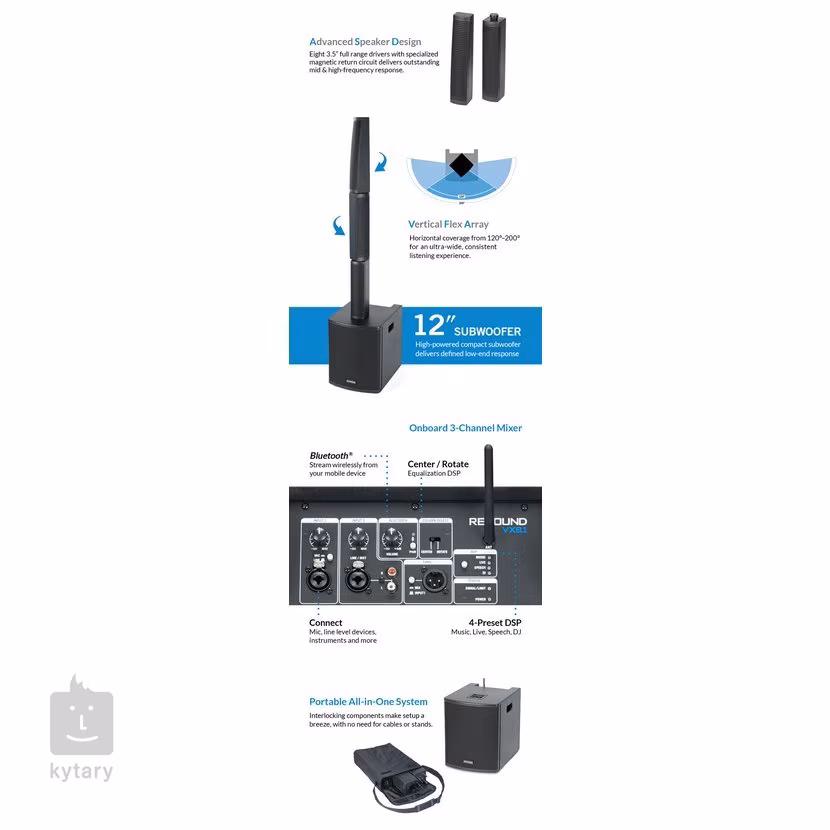 Subwoofer disponuje 12“ basovým reproduktorem o výkonu 350W, stejného výkonu potom dosahuje trojice satelitů s osmi 3,5“ výškovými reproduktory. Satelity můžete navíc otáčet na obě strany o 90 stupňů. Integrovaný mixpult nabízí dva kombinované XLR/Jack konektory pro mikrofony a hudební nástroje. Na druhém kanálu můžete využít stereo RCA konektorů pro připojení hudebního přehrávače nebo DJ pultu a třetí kanál je potom vyhrazen pro zařízení s bezdrátovým připojením. XLR výstup slouží pro připojení do dalšího PA nebo mixážního pultu, Součástí balení je ochranný obal pro trojici satelitů.