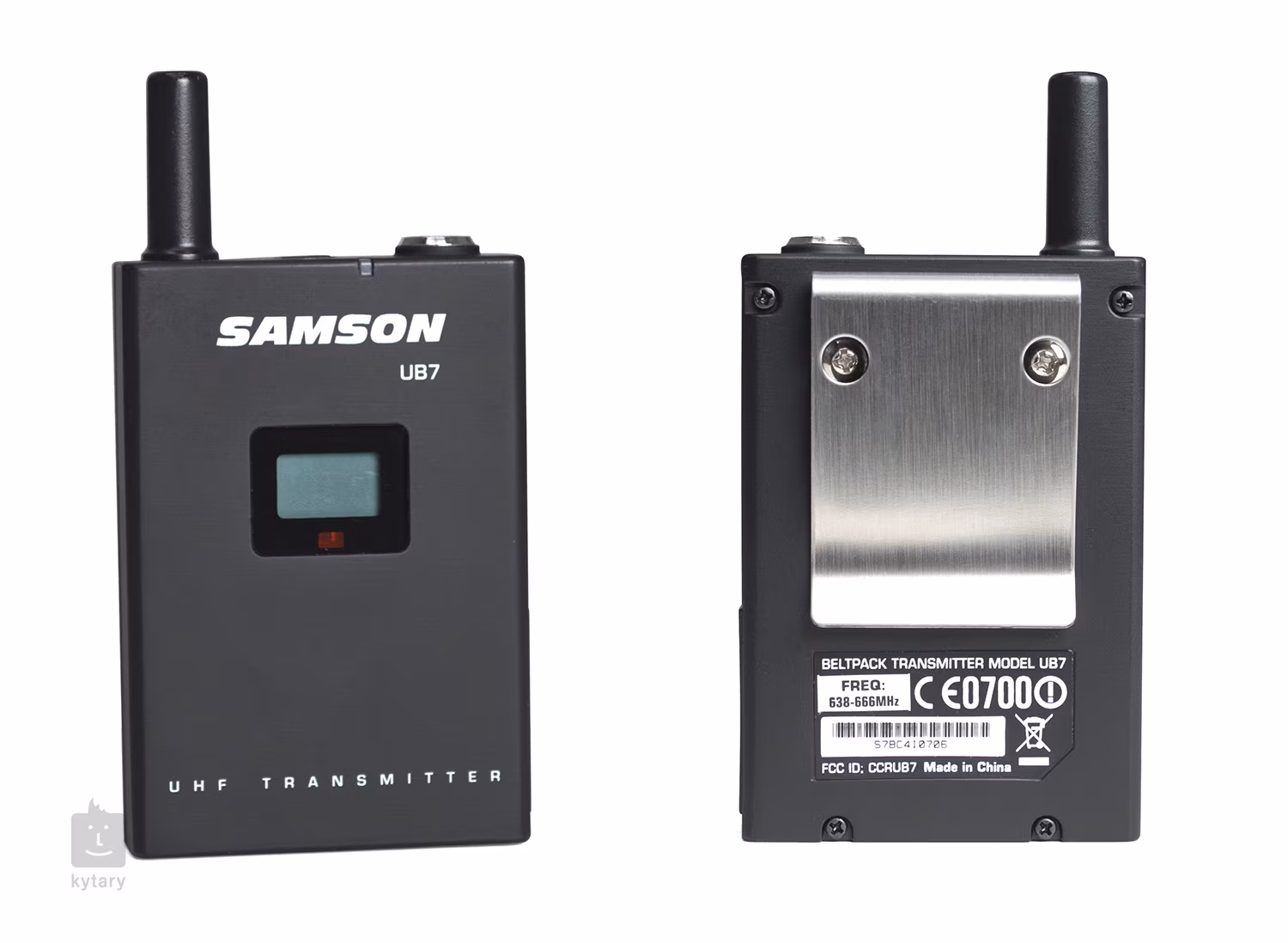 Vysílač UB7 nabízí uzamykatelný mini XLR vstup pro hlavový mikrofon QV s hyperkardioidní charakteristikou, LCD displej a ovladač Gain či přepínač zámku pro zablokování ovládání. Vysílač vydrží v provozu až 15 hodin za podpory dvou AA baterií. Zadní strana disponuje železnou klipsnou na pásek.