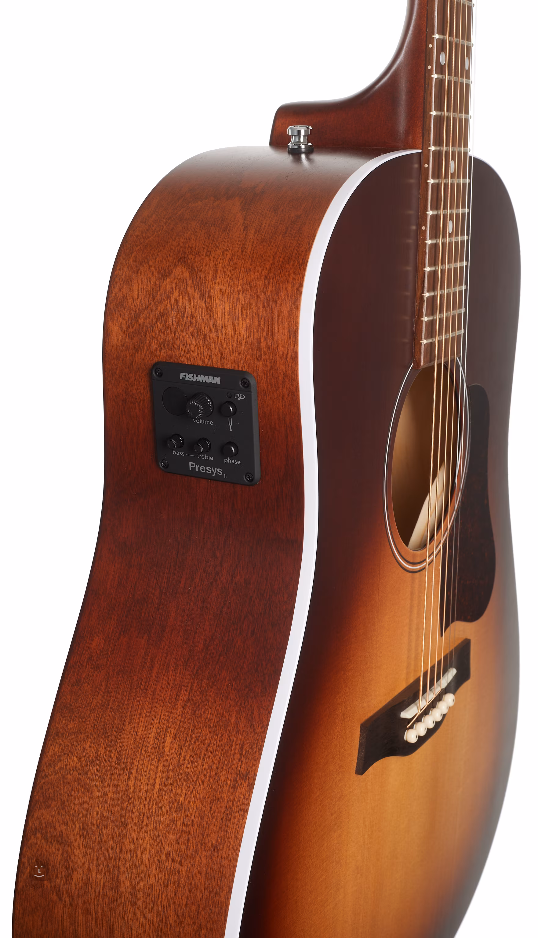 Možnost ozvučení nabízí podkobylkový piezo snímač Fishman Sonicore a předzesilovač Fishman Presys II s ovladačem hlasitosti, dvoupásmovým ekvalizérem, tlačítkem Phase pro potlačení efektu zpětné vazby a zabudovanou ladičkou. Struny jsou uchyceny v chromovaných ladících mechanikách a palisandrové kobylce. Pěkné zpracování podtrhuje finiš topu v barvách podzimu (Autumn Burst), oboustranná bílá obvodová lemovka těla a pickguard z imitace želvoviny.
