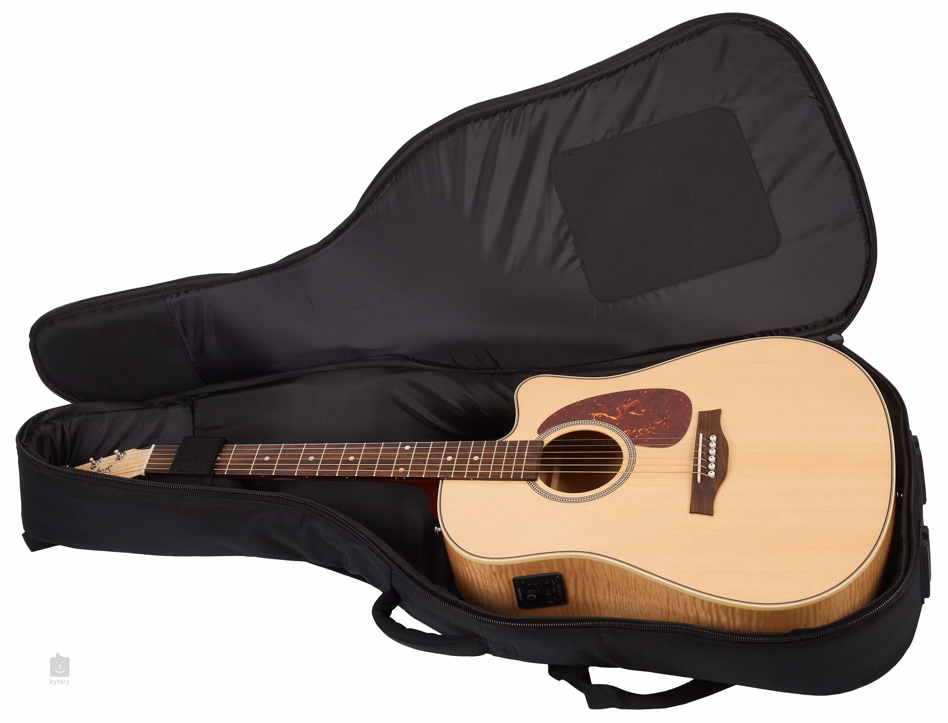 Možnost ozvučení nabízí podkobylkový piezo snímač Fishman Sonicore a předzesilovač Fishman Presys II s ovladačem hlasitosti, dvoupásmovým ekvalizérem, tlačítkem Phase pro potlačení efektu zpětné vazby a zabudovanou ladičkou. Struny jsou uchyceny v chromovaných ladících mechanikách a palisandrové kobylce. Pěkné zpracování podtrhuje rozeta se vzorem rybí kosti, oboustranná obvodová lemovka těla, pickguard z imitace želvoviny a firemní logo na typické hlavici kytar Seagull.
