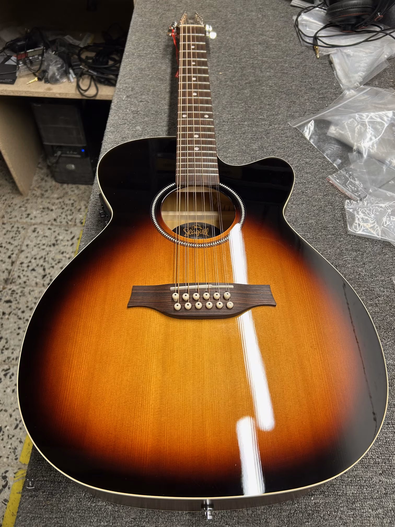 Dvanáctistrunná elektroakustická kytara Seagull S12 CH CW Spruce Sunburst GT Presys II je určena hráčům, kteří preferují nástroje s menším tvarem těla a velkým zvukem. Její přední deska je vyrobena z tlakově testovaného masivního smrku, zadní deska a luby jsou zhotoveny ze tří vrstev překližované plané třešně, která poskytuje nástroji tónový charakter na pomezí vřelého zvuku mahagonu a jasnosti javoru. Top zdobí lesklý finiš v provedení Sunburst.