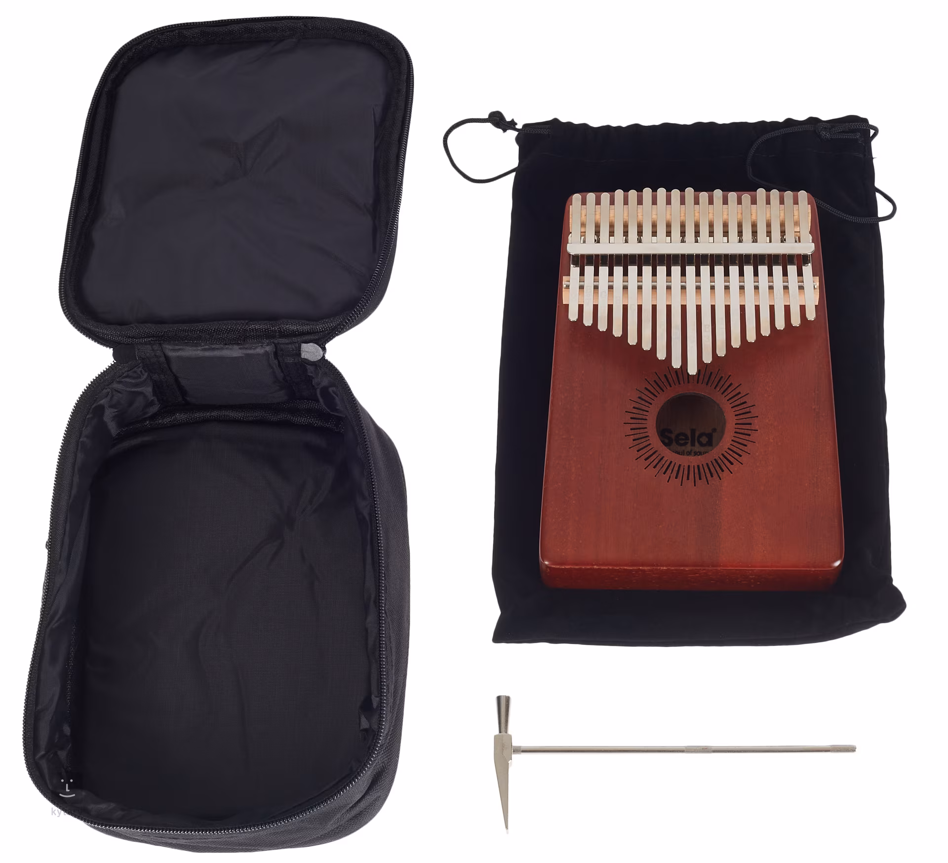Kalimba je unikátní melodický nástroj, který přidá do vaší tvorby nebo live performance unikátní a nezaměnitelný prvek. Může sloužit k doprovodné nebo sólové hře. Nástroj je vyroben z kvalitního mahagonového dřeva, které je pověstné svými skvělými rezonančními vlastnostmi. Ocelové plátky jsou laděné do tóniny C dur, konkrétně v rozsahu C4-E6, a poskytují velice čistý a vřelý zvuk. Díky své nízké hmotnosti a malým rozměrům je tento nástroj ideální na cesty – proto v balení najdete praktické přepravní pouzdro. Kromě toho je součástí také látkový obal a ladicí kladívko.