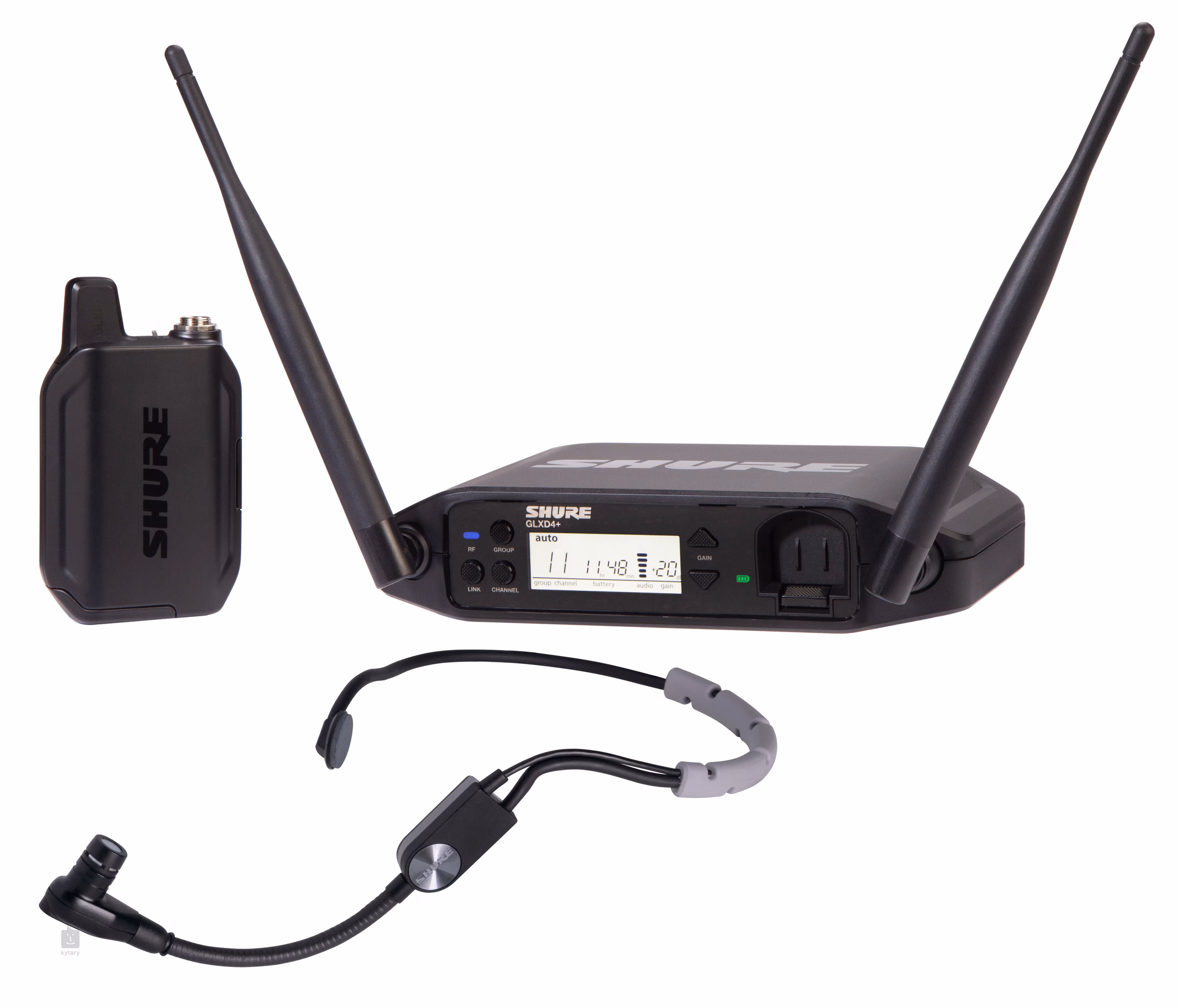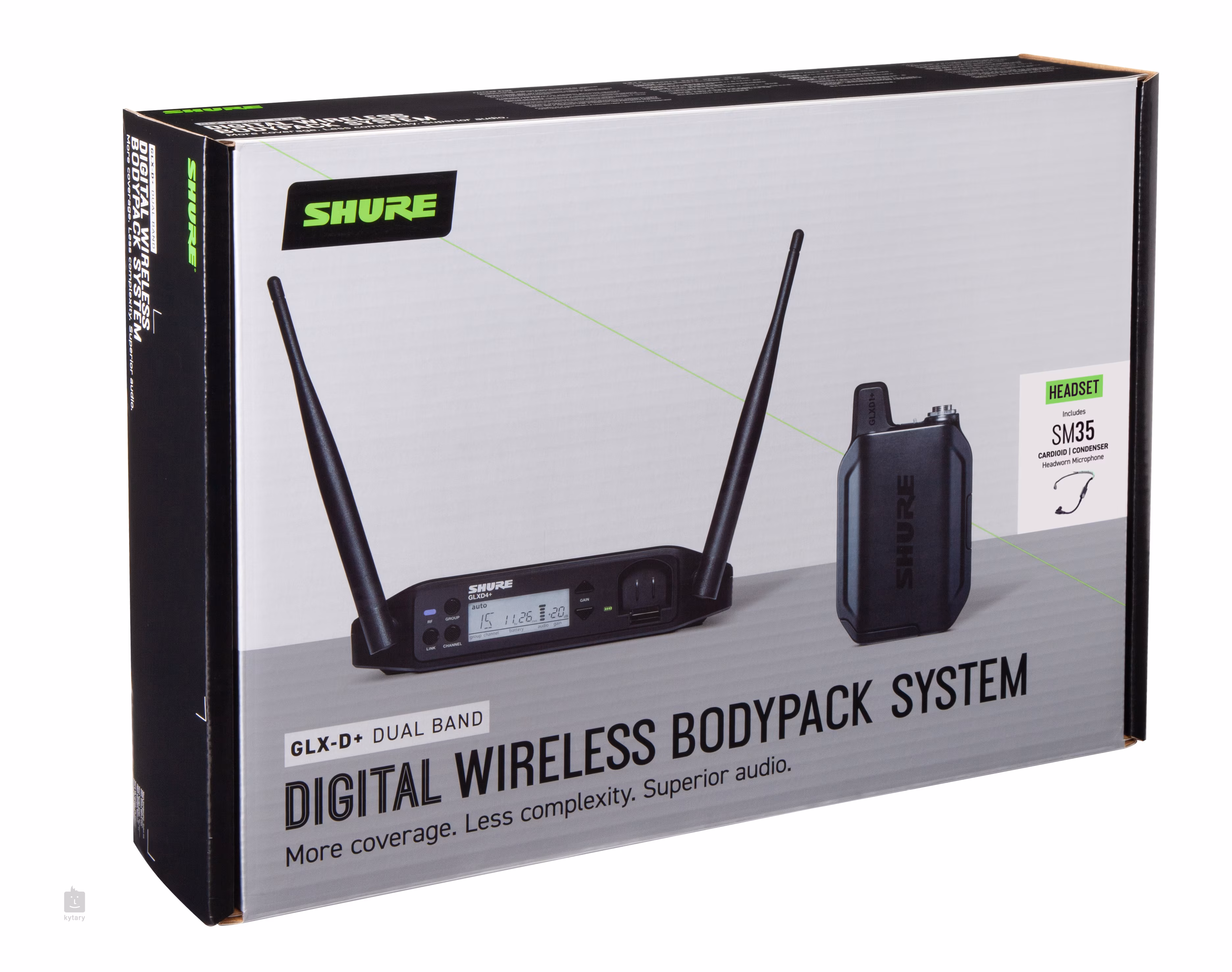 Bezdrátový set GLXD14+ HEADSET SYSTEM W/SM35 obsahuje náhlavní kondenzátorový mikrofon SM35, bodypack vysílač GLXD1+ a přijímač GLXD4+. Součástí balení je napájecí zdroj, SB904 li-ion baterie a pevné černé pouzdro.
