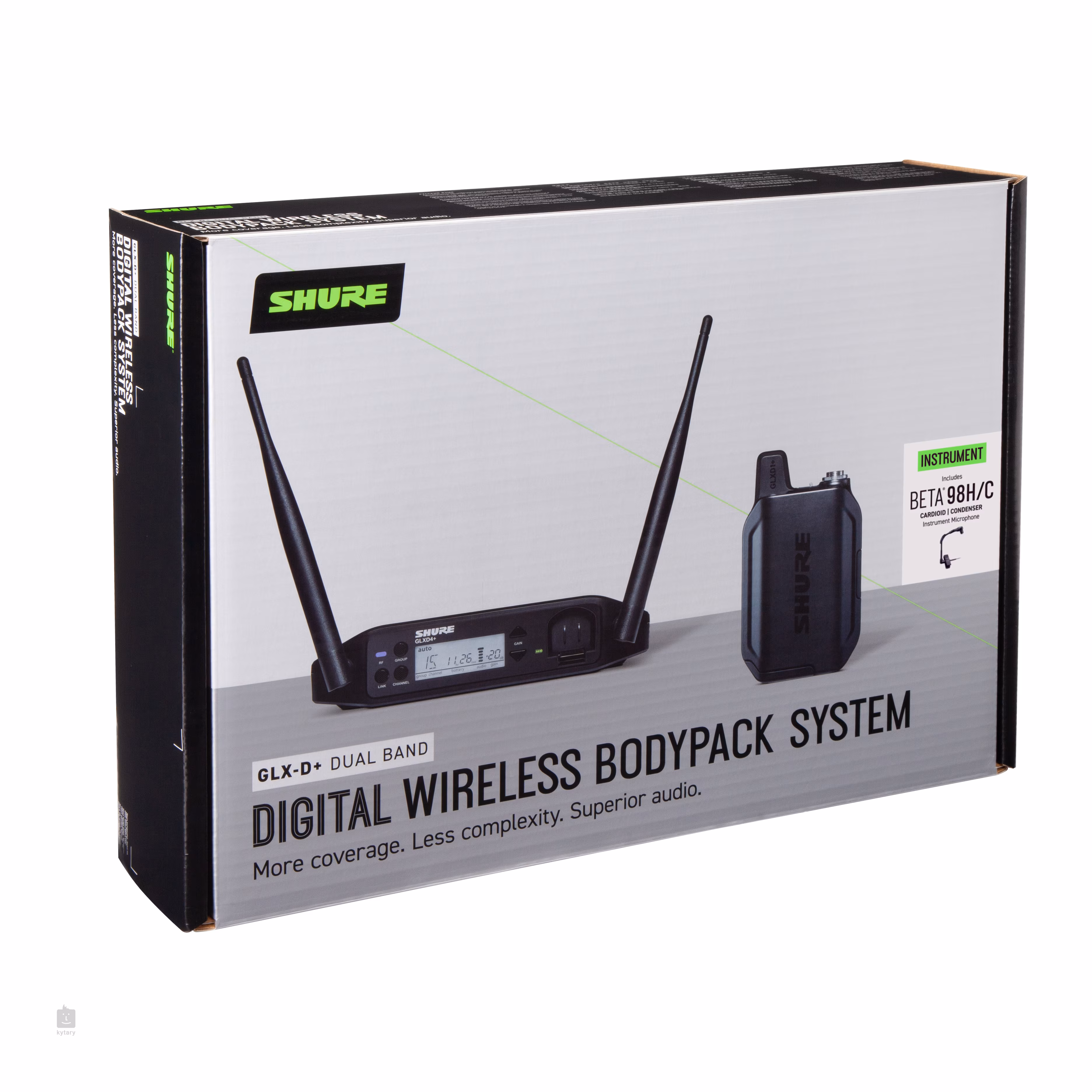 Bezdrátový set GLXD14+ INSTRUMENT SYSTEM W/BETA98 obsahuje kondenzátorový nástrojový mikrofon BETA98H/C s flexibilním husím krkem ideální pro snímání žesťových, dřevěných dechových nástrojů nebo perkusí, bodypack vysílač GLXD1+ a přijímač GLXD4+. Součástí balení je napájecí zdroj, SB904 li-ion baterie a pevné černé pouzdro.