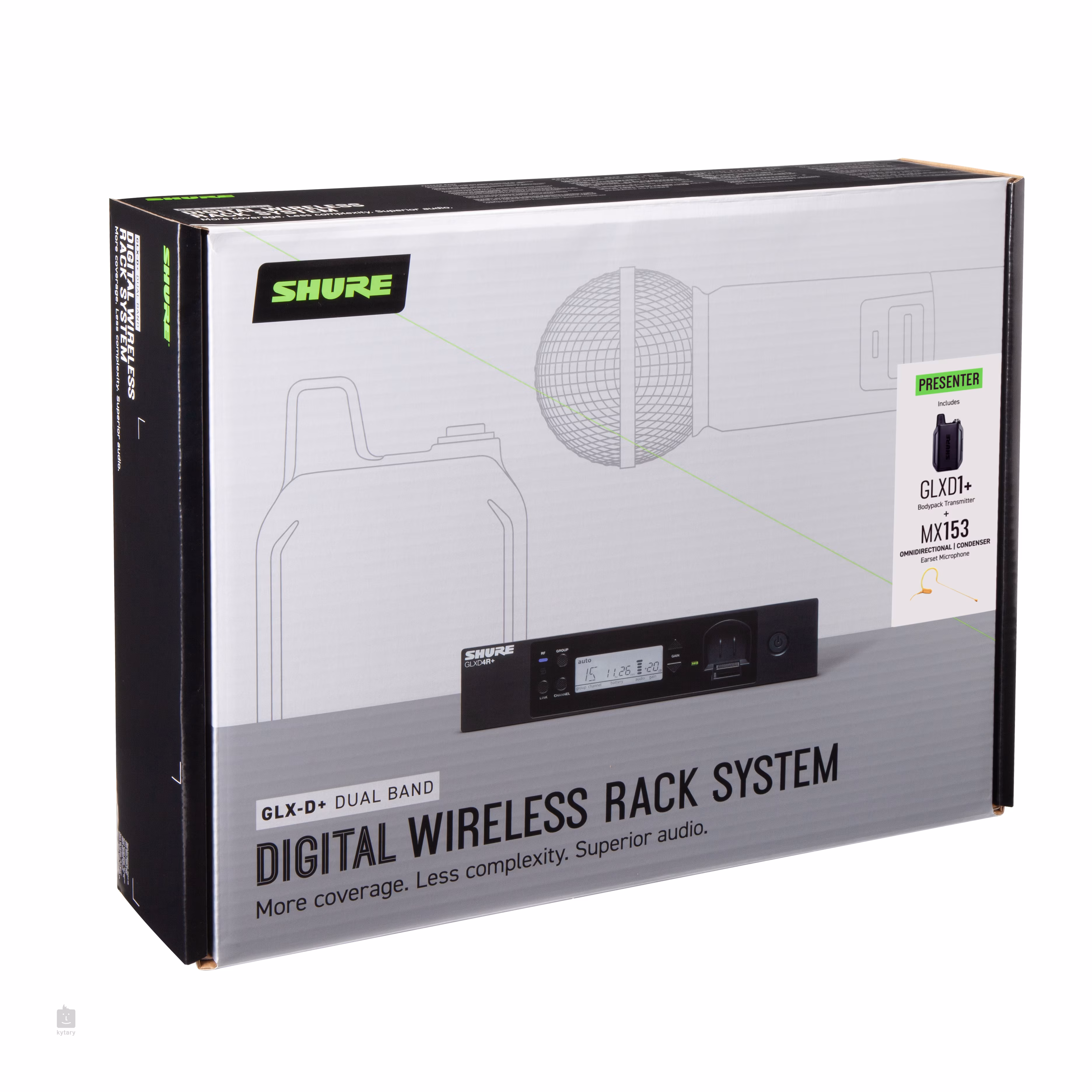 Bezdrátový set GLXD14R+ HEADSET SYSTEM W/MX153 obsahuje prémiový náhlavní kondenzátorový mikrofon MX153, bodypack vysílač GLXD1+ a rackový přijímač GLXD4R+. Součástí balení je napájecí zdroj, SB904 li-ion baterie, rackový hardware a vinylový obal se zipem.