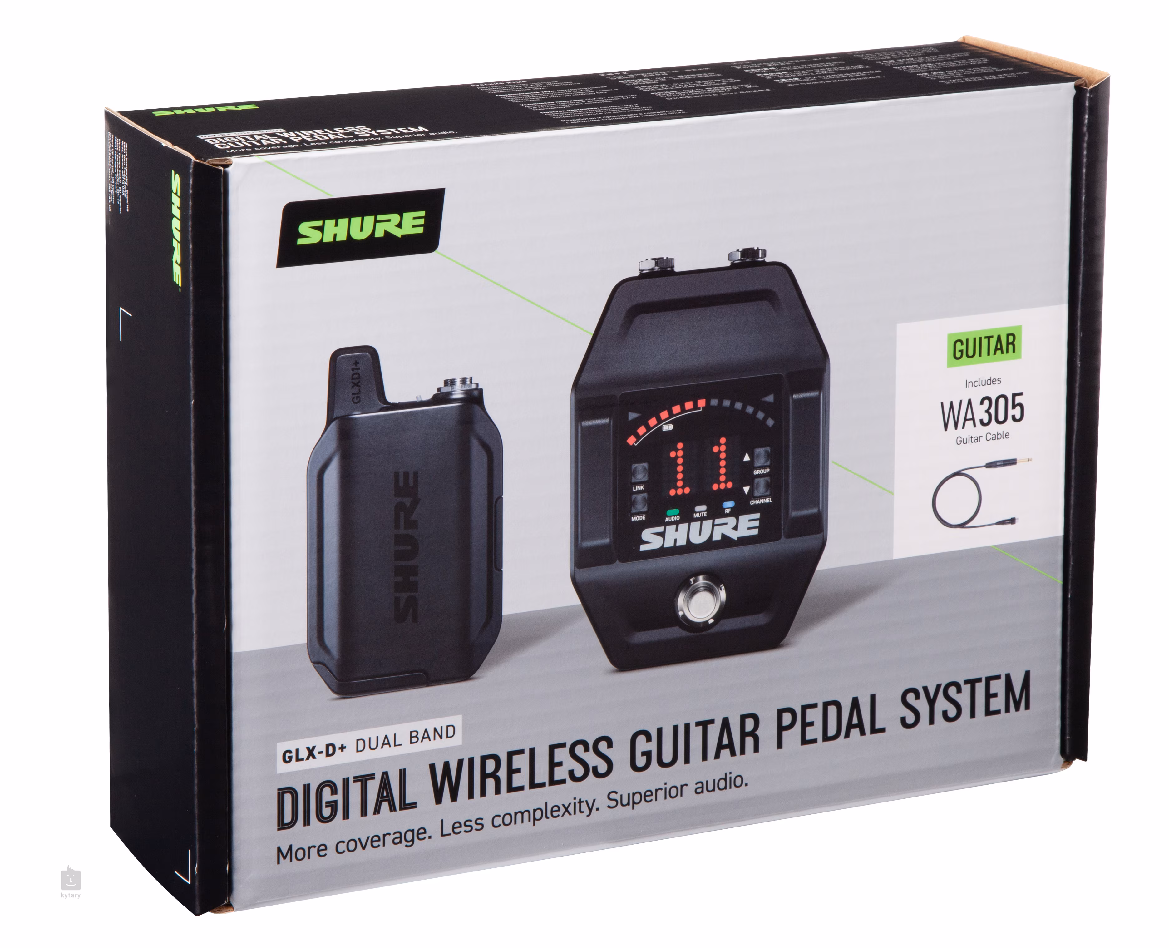 Bezdrátový set GLXD16+ GUITAR PEDAL SYSTEM obsahuje prémiový kytarový kabel WA305, digitální bodypack GLXD1+ a kytarový pedálový přijímač GLXD6+.