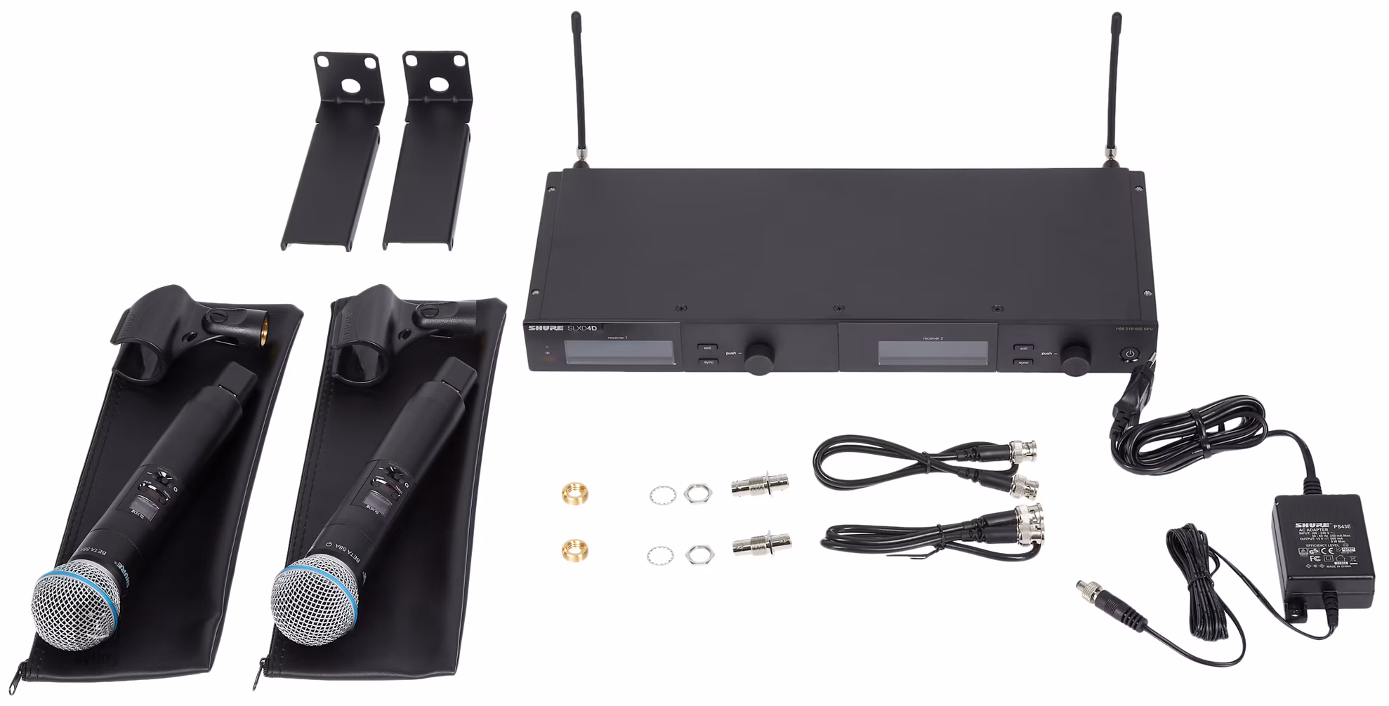 SLXD24D je duální bezdrátový set od Shure vhodný pro live performance nebo konference. Zajistí kvalitní a ničím nerušený bezdrátový přenos vašeho hlasu. Přijímač SLXD4D obsahuje XLR a Jack výstup do mixpultu nebo zesilovače. Vysílač SLXD2 s dynamickým mikrofonem Shure B58 potom obsahuje přepínač On/Off, dvoutlačítkový ovládací panel a displej s informacemi o stavu baterie nebo uživatelským nastavení mikrofonu. Jeho napájení probíhá prostřednictvím dvou AA baterií. Bezdrátový set je k dostání v několika frekvenčních pásmech.