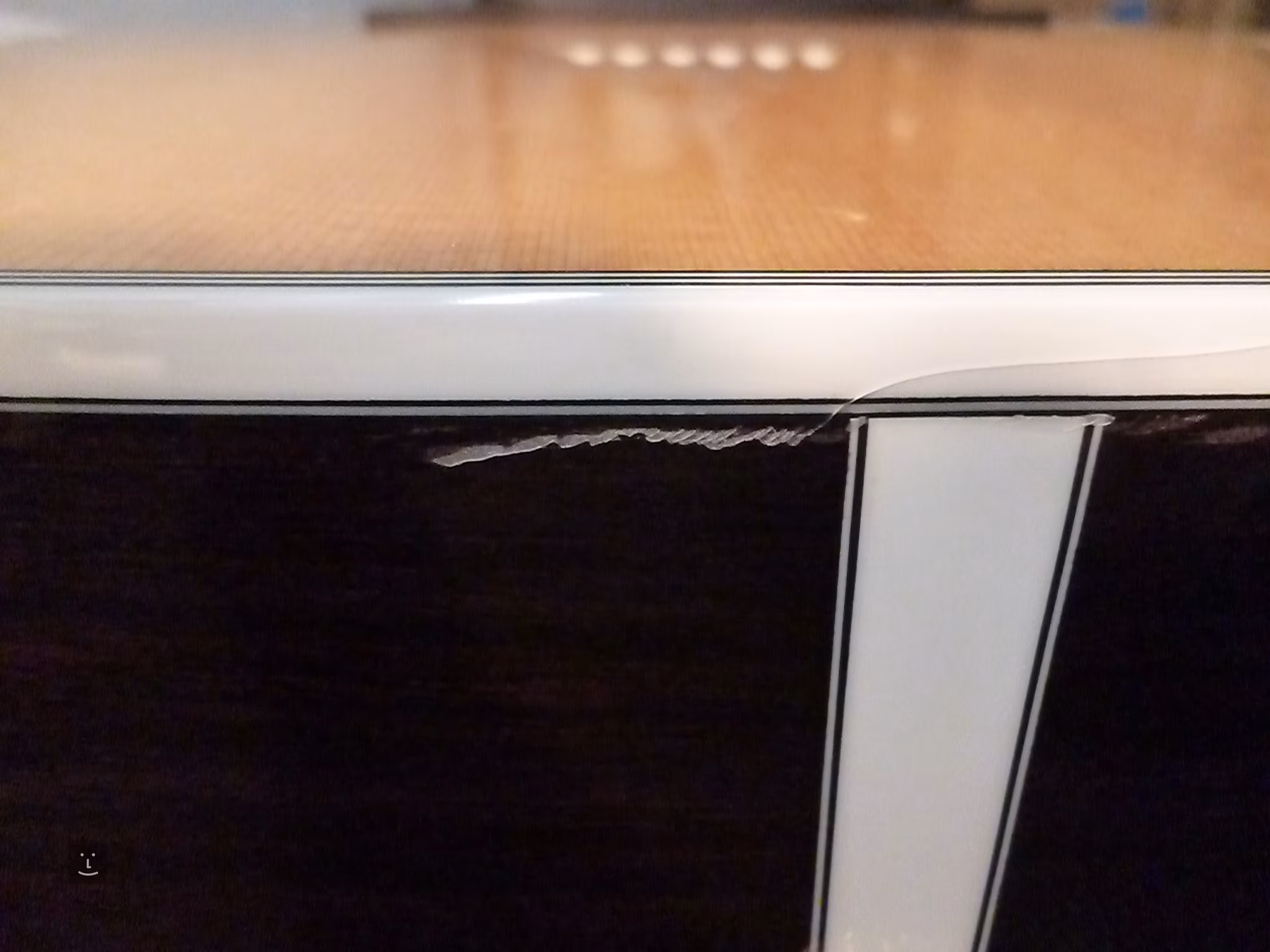 Naražená spodní hrana nástroje, prasklina v laku. Viz foto.