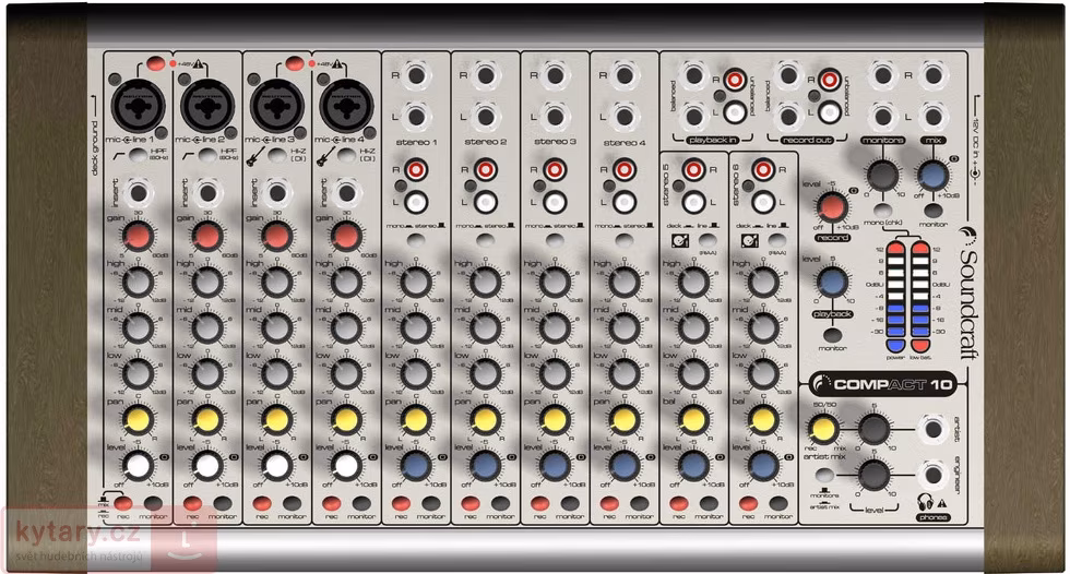 Vysoce kompaktní mixážní pult s širokým polem použití. Vhodný pro kapely, kluby, hudební soubory, DJs, malá domácí studia, recording a pro aplikace v menších zvukových systémech. Obsahuje mikrofonní, linkové a speciální "DI" nebo "Direct" vstupy pro kytary, stereo vstupy pro keyboardy, CD / tape a přepínatelné gramofonové předzesilovače RIAA. Vstupní impedance DI vstupu odpovídá výstupní impedanci nástroje, což zaručuje optimální zachycení zvuku v profesionální kvalitě. Poslech během nahrávání je snažší díky speciálnímu směšovacímu systému, který dovoluje kontrolovat mix v počítači a zároveň daný track v muzikantově sluchátkách. Při použití tohoto analogového mixu s počítačem můžete nahrávat a zároveň poslouchat hudbu z počítače bez signálového zpoždění karty nebo procesoru. Serie COMPACT obsahuje třípásmový ekvalizér na každém vstupu, phantomové napájení 48V, symetrické a nesymetrické konektory, funkce Record a Playback, nezávislé sluchátkové výstupy a výstupy pro monitory.