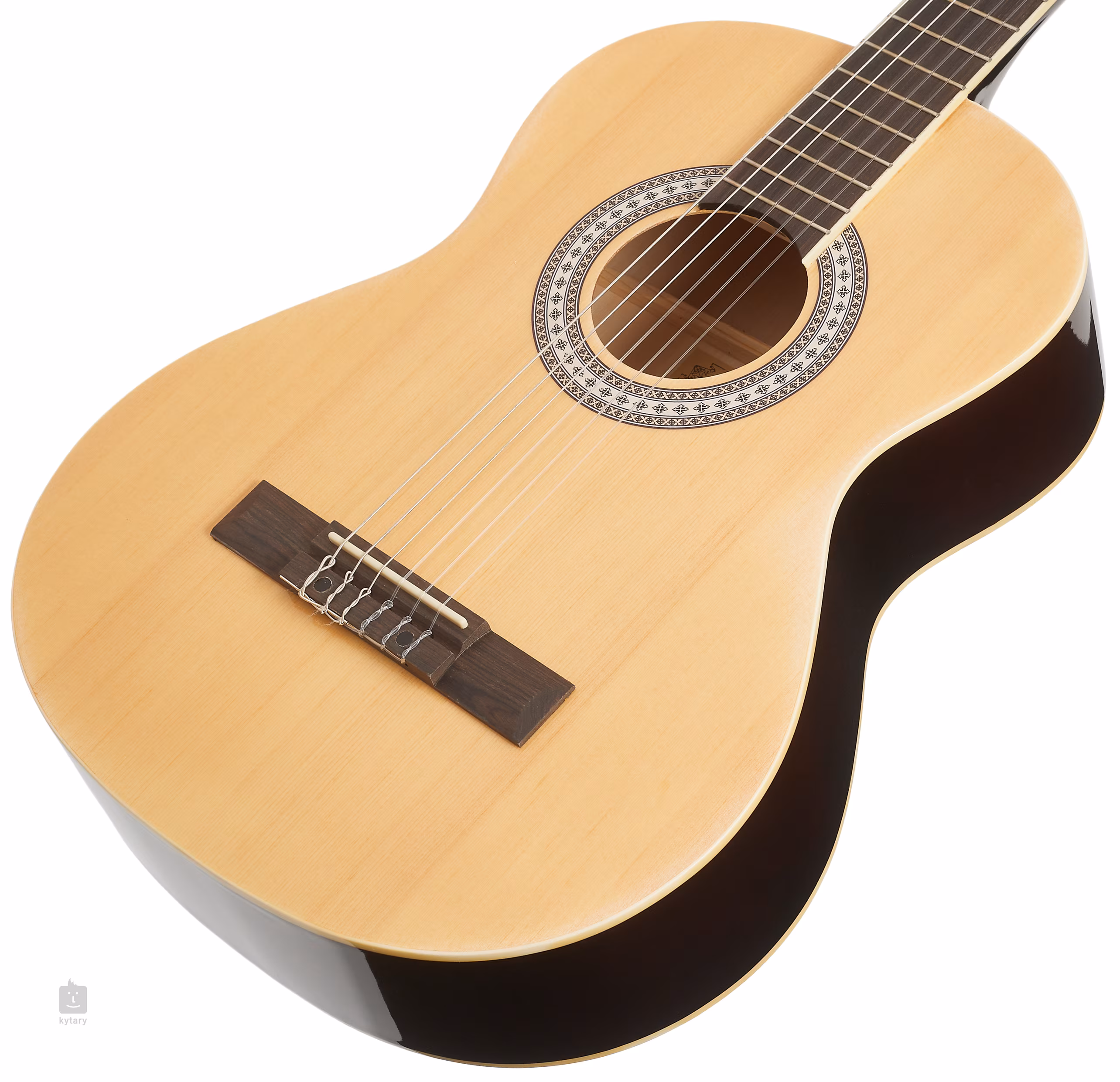 Samozřejmostí u dětských kytar je kratší menzura a užší krk. Struny jsou uchyceny v chromovaných ladicích mechanikách s kolíčky z imitace perleti a kobylce z blackwoodu. Stylové zpracování podtrhuje bílá lemovka a dekorativní rozeta.