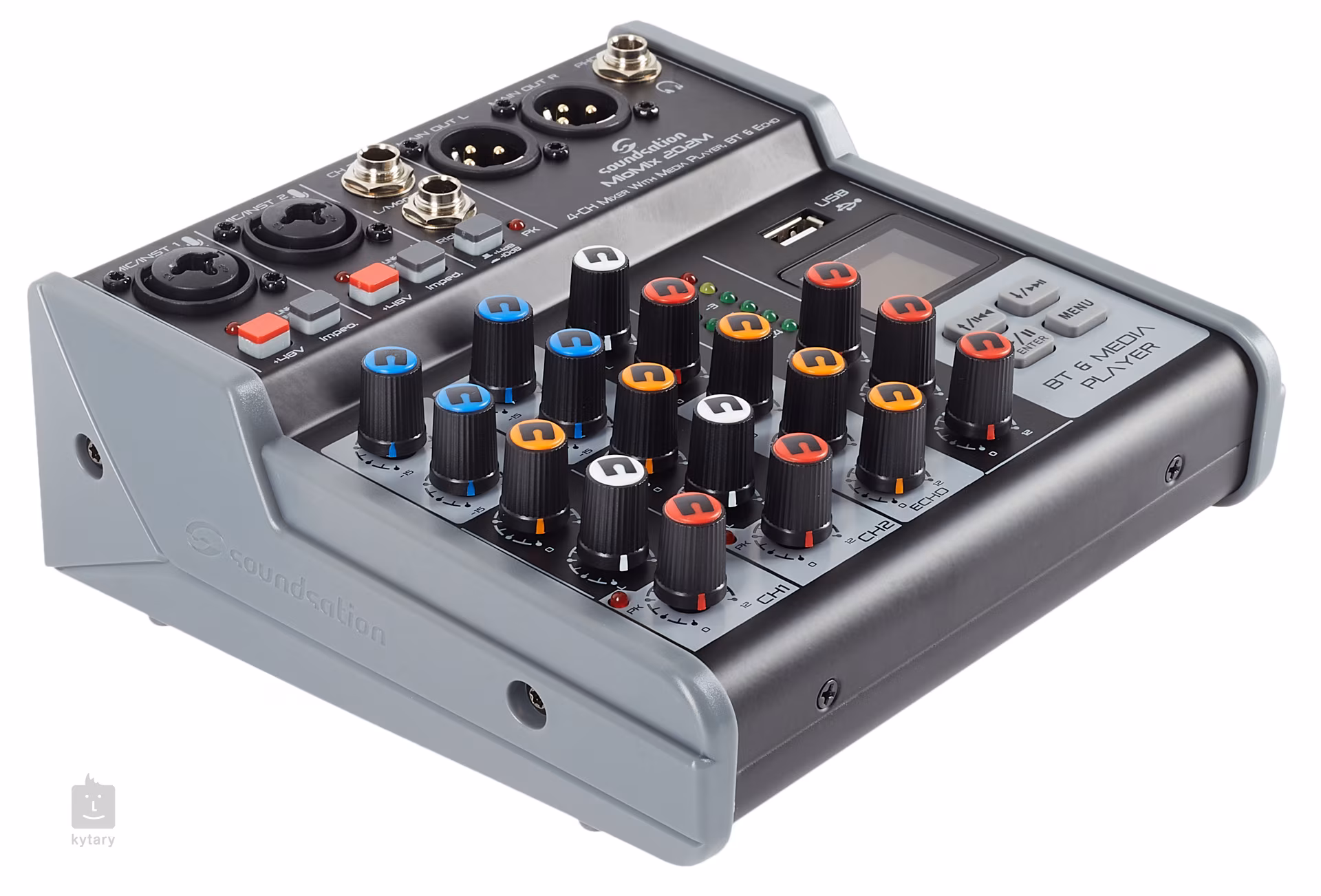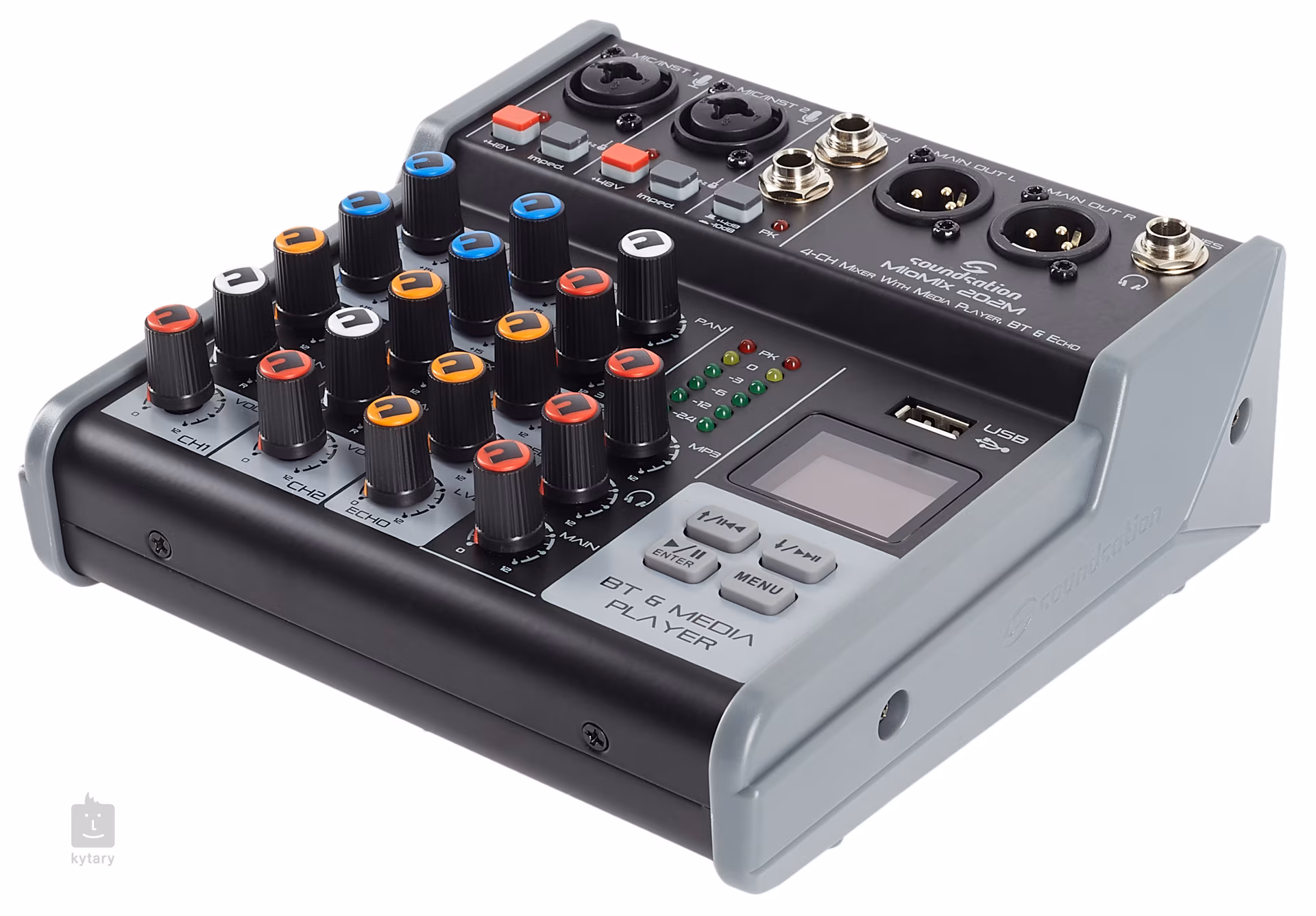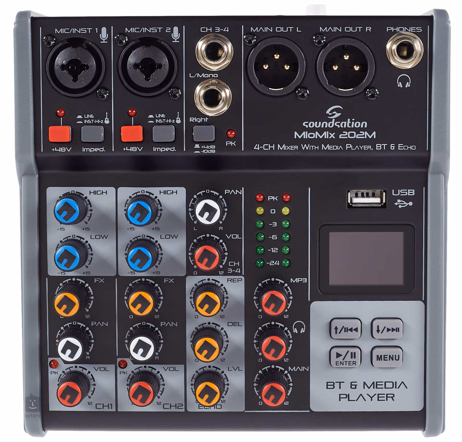 Miomix 202M je čtyřkanálový mixážní pult se dvěma kombinovanými XLR/TRS vstupy (zde připojíte mikrofony, elektifikované nástroje či linkové signály), dvěma Line vstupy, dvěma XLR výstupy do PA, sluchátkovým výstupem pro detailní monitoring. Každý kanál můžete upravit dvoupásmovým ekvalizérem, nastavíte panoramu a můžete také přimíchat echo efekt. Nechybí fantomové napájení pro kondenzátorové mikrofony. Přehled o vašem nastavení získáte prostřednictvím šesti úrovňového LED ukazatele a podsvíceného displeje.
