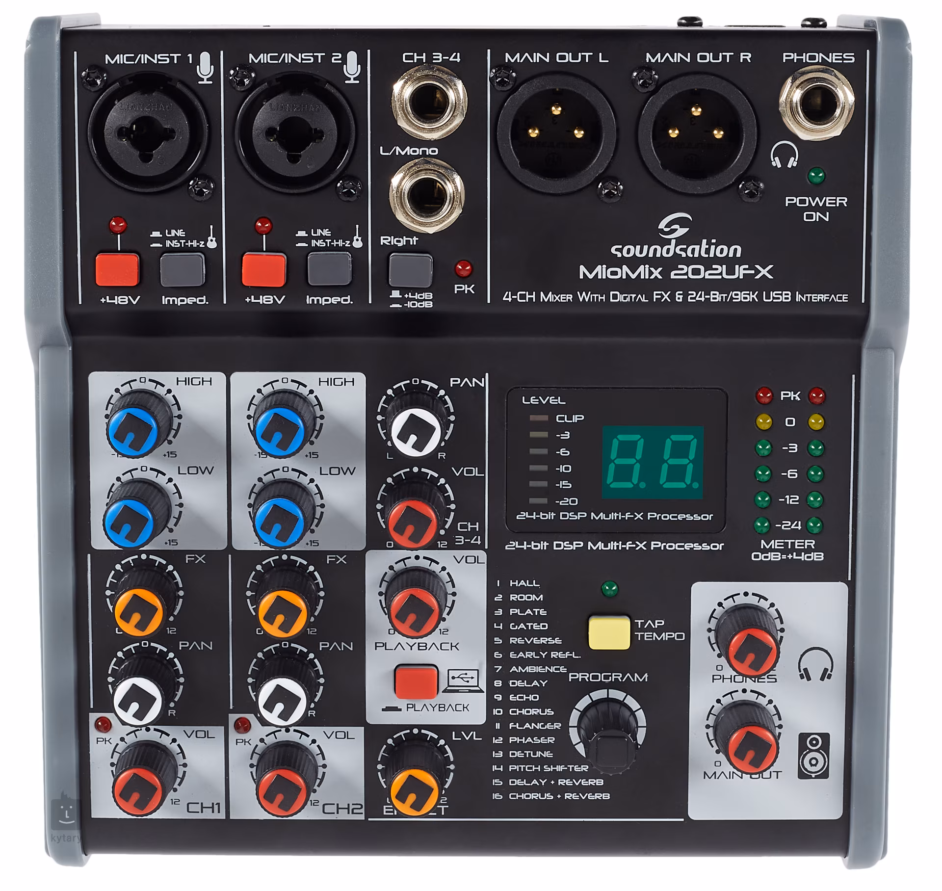Miomix 202UFX je čtyřkanálový mixážní pult se dvěma kombinovanými XLR/TRS vstupy (zde připojíte mikrofony, elektifikované nástroje či linkové signály), dvěma Line vstupy, dvěma XLR výstupy do PA, sluchátkovým výstupem pro detailní monitoring. Každý kanál můžete upravit dvoupásmovým ekvalizérem, nastavíte panoramu a můžete také přimíchat signál z FX jednotky. Nechybí fantomové napájení pro kondenzátorové mikrofony. Přehled o vašem nastavení získáte prostřednictvím šesti úrovňového LED ukazatele a podsvíceného displeje.
