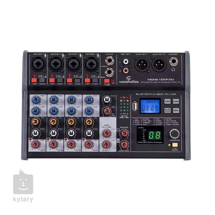Miomix 404FXM je osmikanálový mixážní pult se čtyřmi kombinovanými XLR/TRS vstupy (zde připojíte mikrofony, elektifikované nástroje či linkové signály), čtyřmi line vstupy (2x Jack, 2x RCA / stereo Jack) , dvěma XLR výstupy do PA, sluchátkovým výstupem pro detailní monitoring. Kanály 1 - 4 můžete upravit dvoupásmovým ekvalizérem, všem kanálům nastavíte panoramu a můžete také přimíchat signál z FX jednotky. Nechybí fantomové napájení pro kondenzátorové mikrofony. Přehled o vašem nastavení získáte prostřednictvím šesti úrovňového LED ukazatele a podsvíceného displeje.