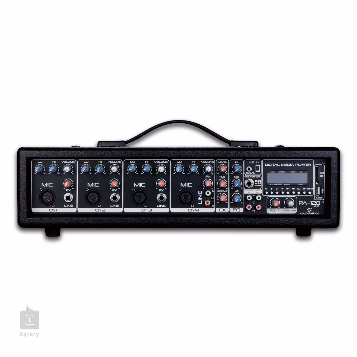 Zesilovač (2x 100 W) obsahuje 6 kanálů, které vám umožní namíchat zvuk z mikrofonů, nástrojů, nebo externího zařízení jako MP3 přehrávače nebo notebooku. Každý kanál disponuje 2pásmovým ekvalizérem, v mastersekci je pak ještě 3pásmový ekvalizér pro finální doladění zvuku.