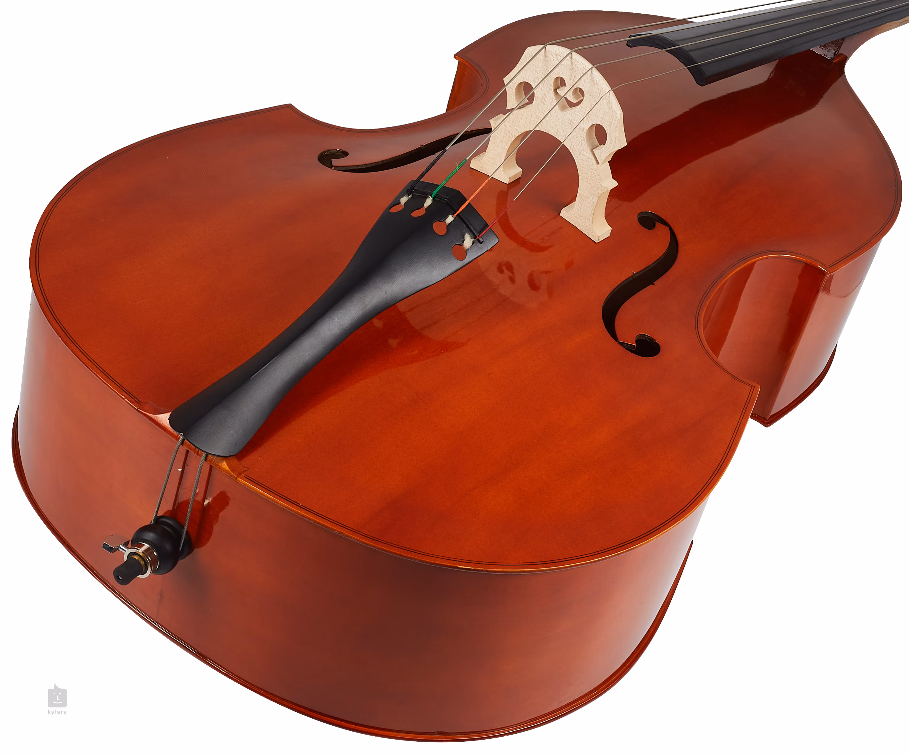 Tělo nástroje je vyvedeno v atraktivní barvě Cherry Brown s lemováním na okrajích, kobylka je javorová a struník z hliníkové slitiny. Dodáváno je i příslušenství, ke kontrabasu dostanete obal se zádovými popruhy, kalafunu a smyčec, tedy vše, co do začátku potřebujete.