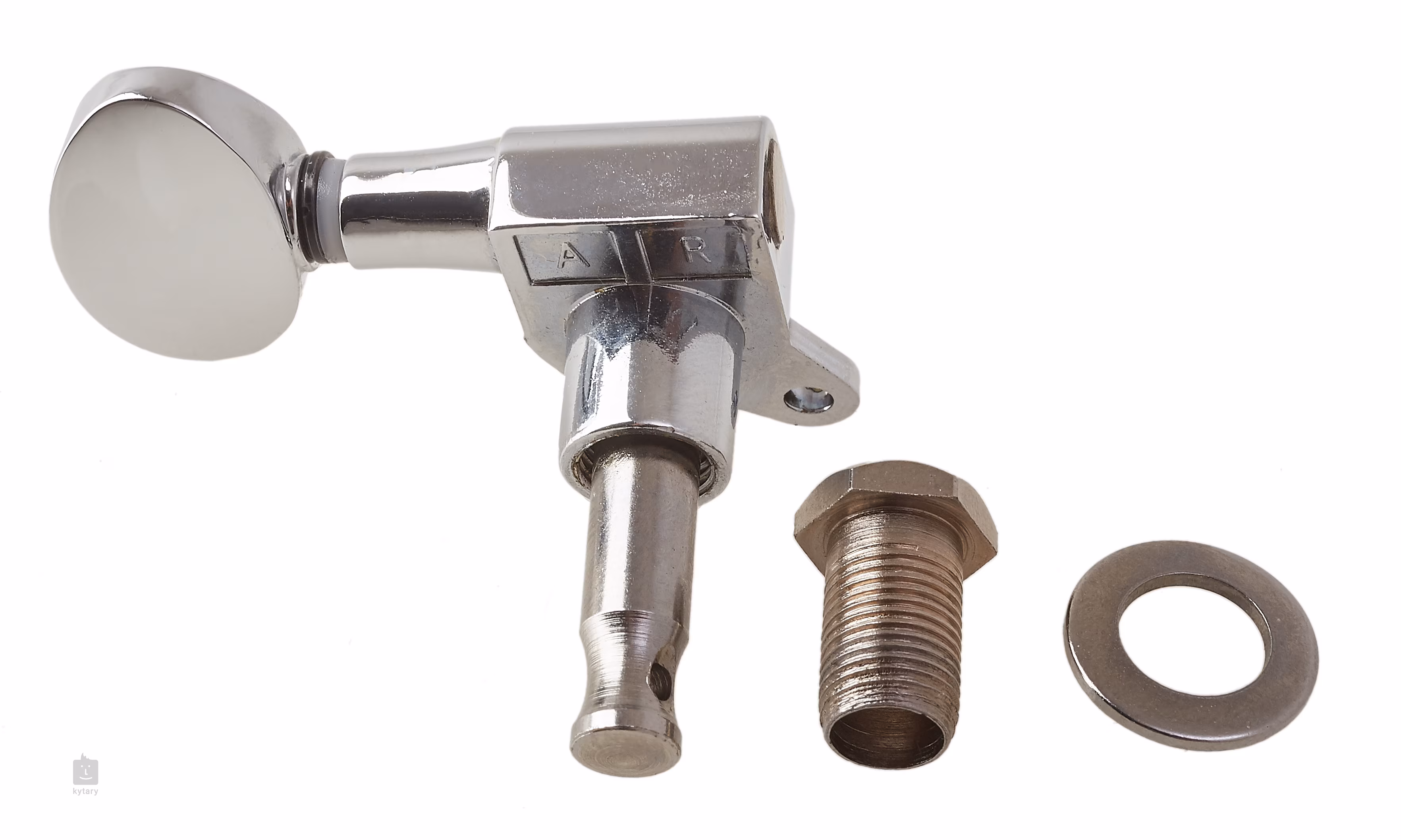 Set chromovaných ladicích mechanik pro elektrickou kytaru. Balení obsahuje šest kusů (šest v řadě).