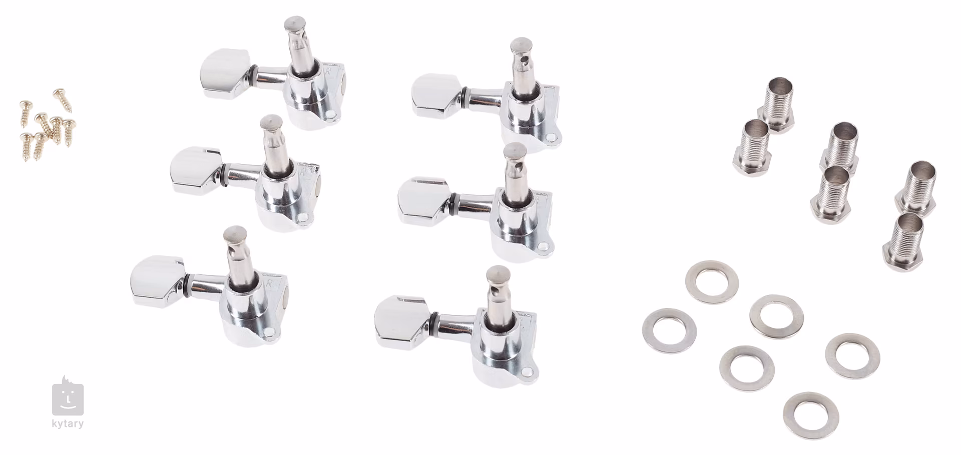 Set chromovaných ladicích mechanik pro elektrickou/akustickou kytaru. Balení obsahuje šest kusů (šest v řadě).