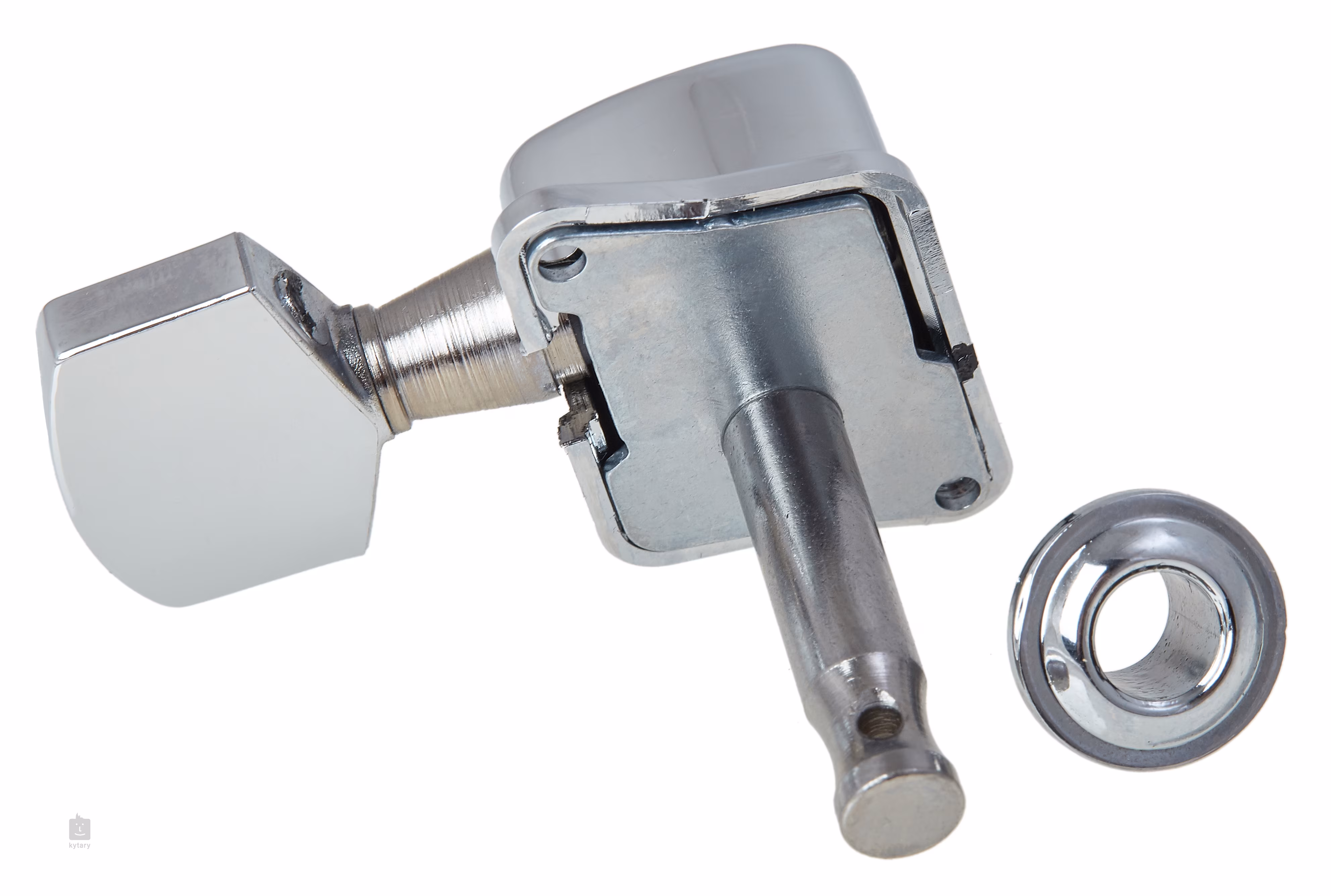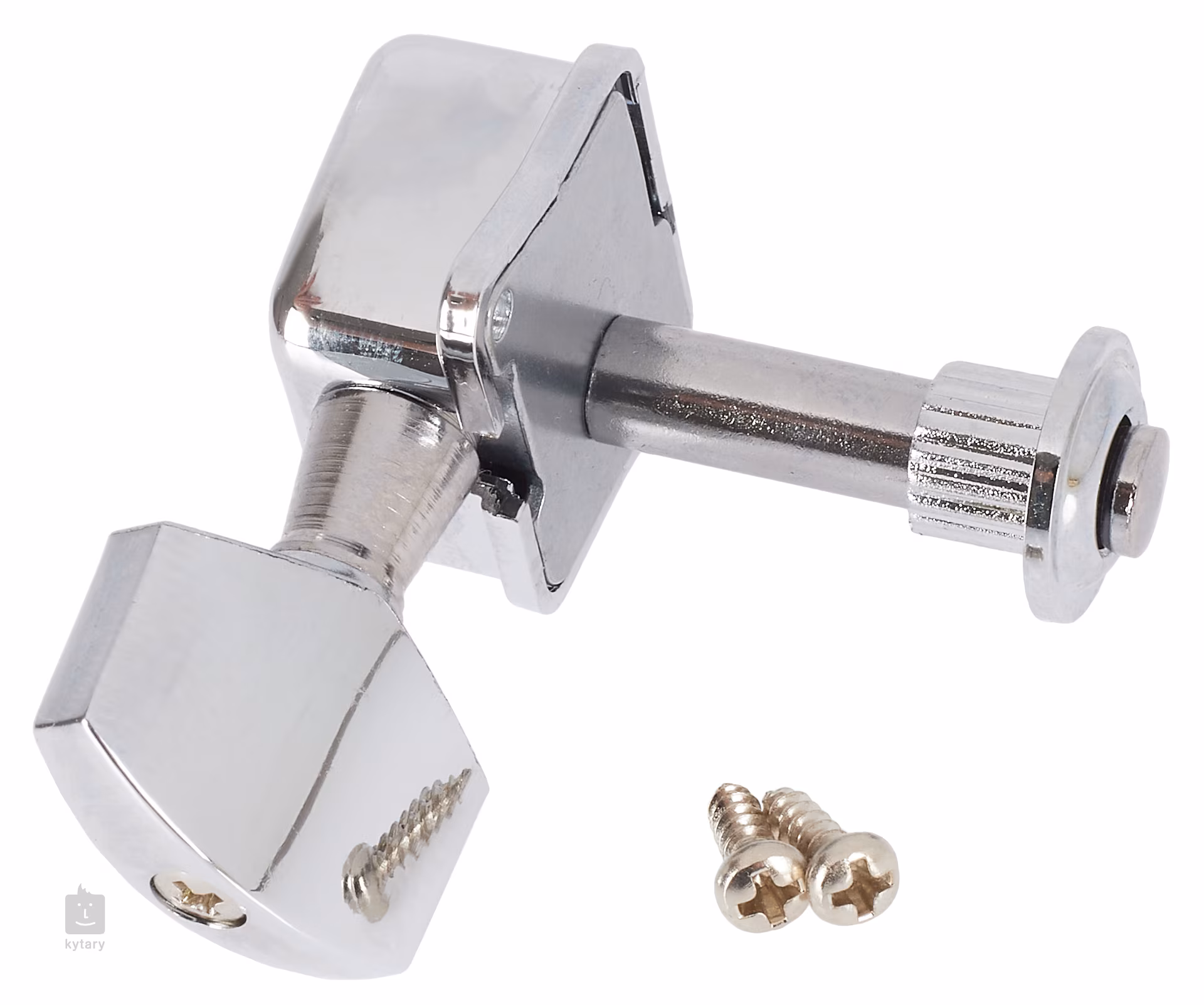 Set chromovaných ladicích mechanik pro elektrickou kytaru ve vintage designu. Balení obsahuje šest kusů mechanik (tři pravé a tři levé) a šrouby k jejich upevnění.