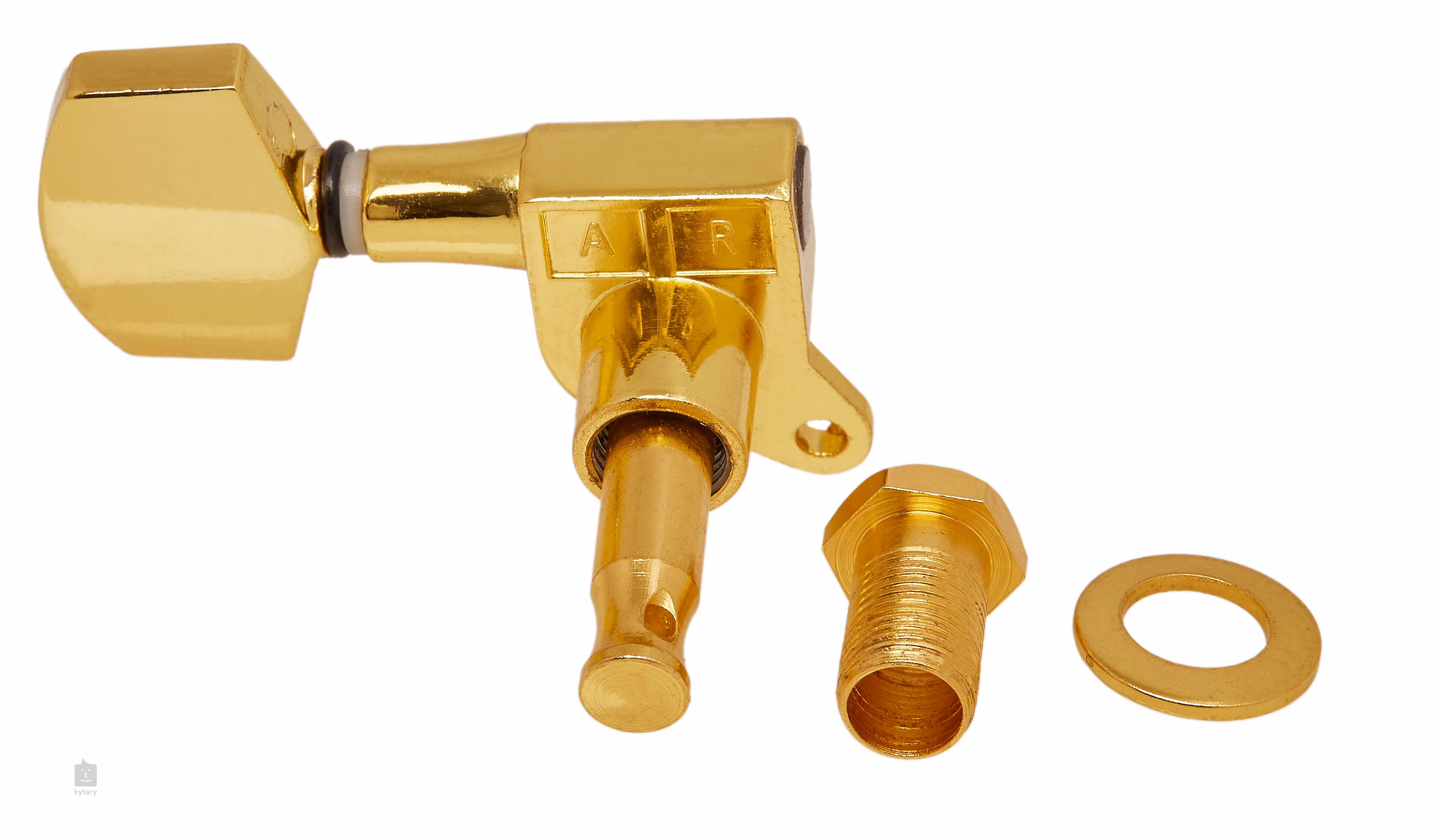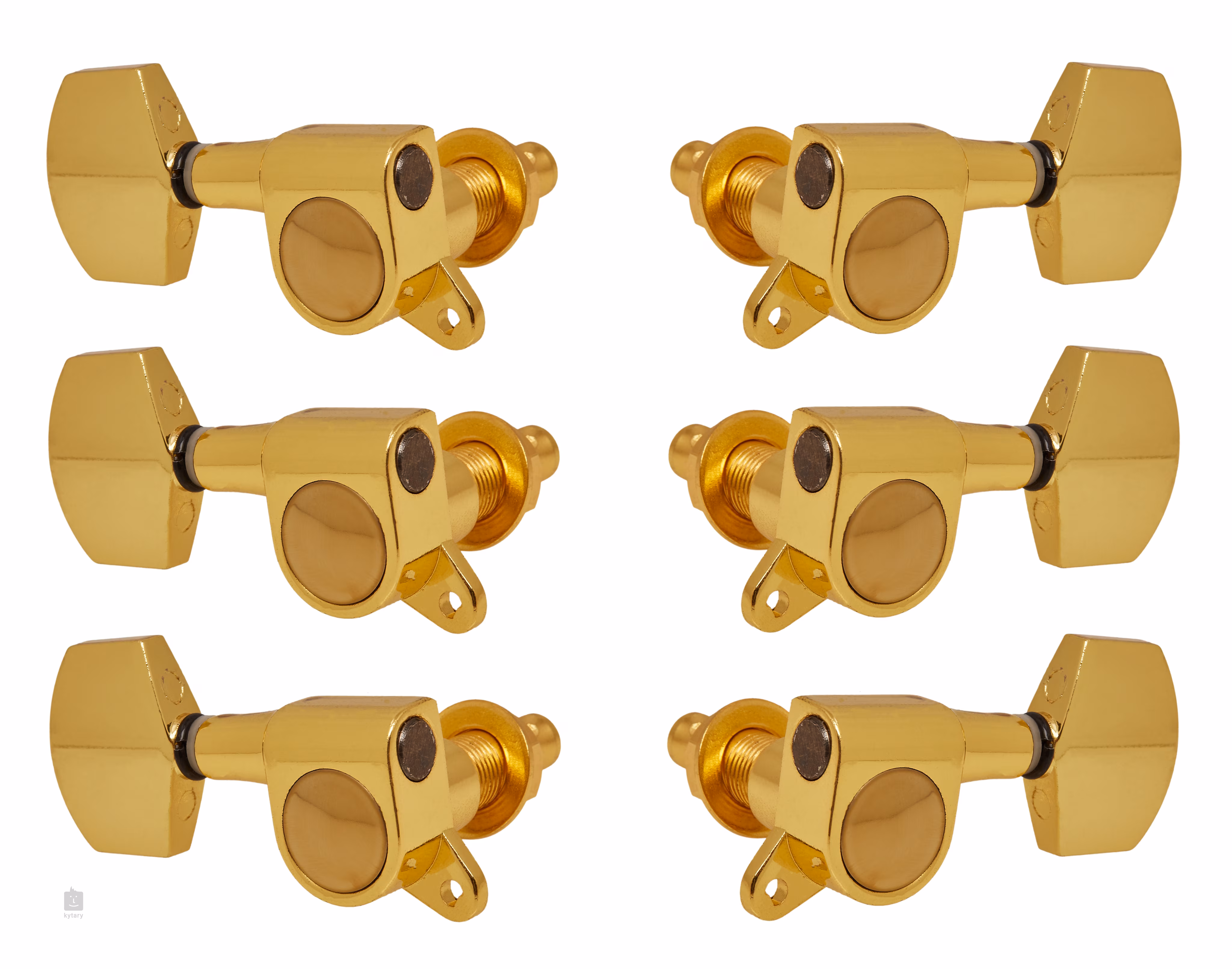 Set pozlacených ladicích mechanik pro elektrickou kytaru. Balení obsahuje šest kusů (tři pravé a tři levé).