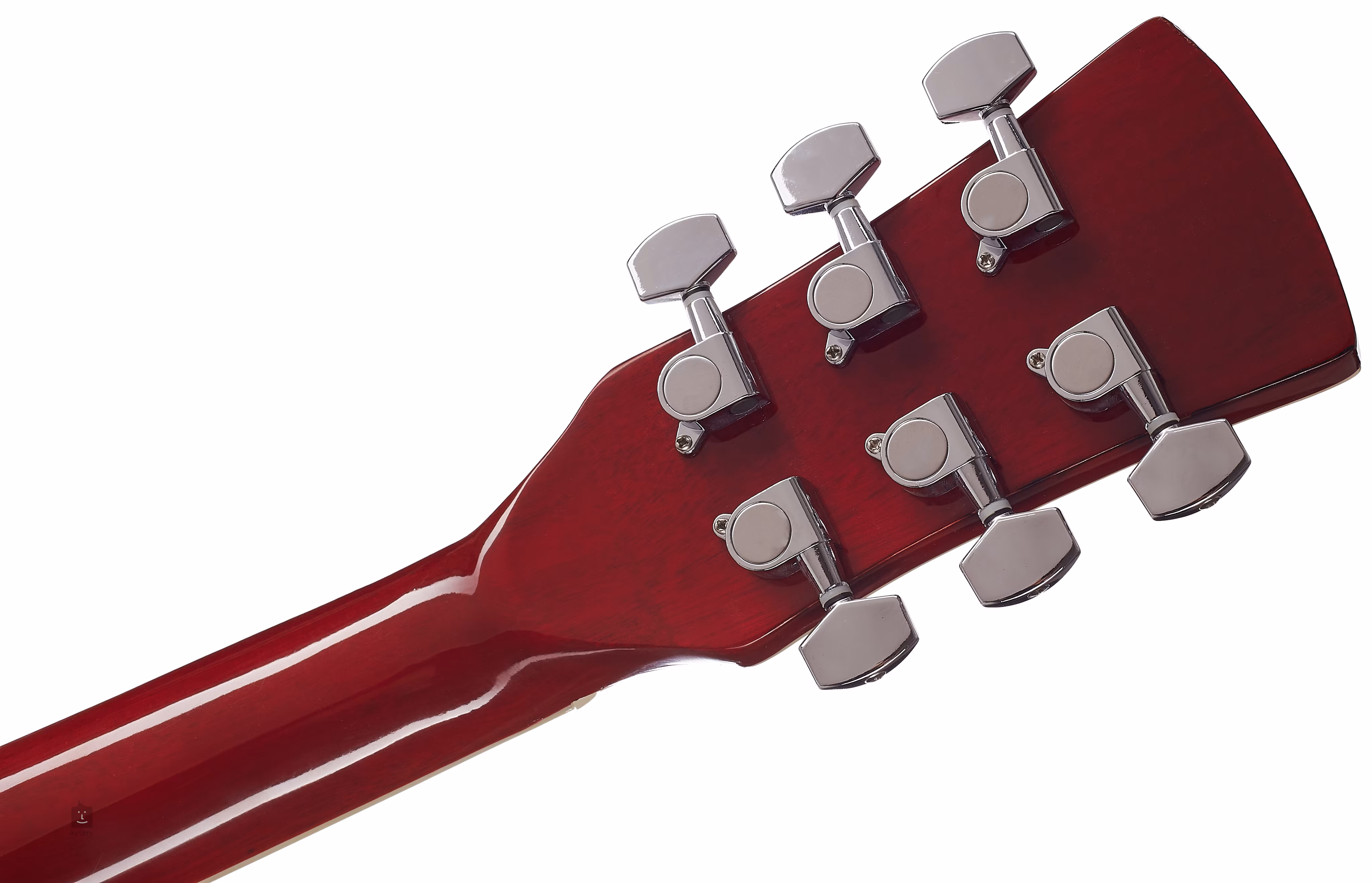 Struny jsou uchyceny v kobylce z hardwoodu a chromovaných Die-Cast ladících mechanikách. Tradiční prvky akustických kytar doplňují světlá lemovka, rozeta a černý pickguard, který zároveň chrání lak nástroje před poškrábáním.