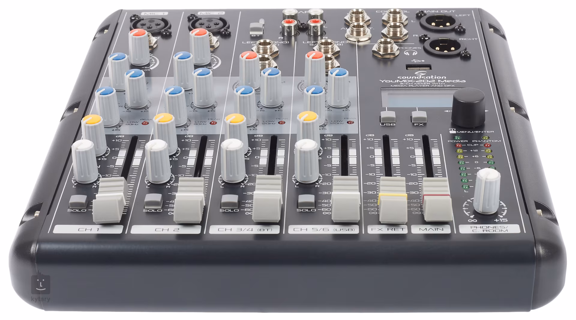 Youmix 202 Media je šestikanálový mixážní pult se dvěma XLR vstupy s mikrofonním preampem, dvěma páry Line vstupů, dvěma XLR výstupy do PA, sluchátkovým výstupem pro detailní monitoring a USB portem pro připojení přehrávače nebo Flash disku. Pult dále disponuje RCA konektory pro připojení hudebních přehrávačů a následné propojení s dalším zařízením. Tuto funkci ocení především DJs a moderátoři na firemních večírcích. Výsledný signál potom můžete upravit dvou až třípásmovým ekvalizérem nebo jedním ze 256 efektů (Room, Hall, Vocal, and Plate reverbs; Delay; Echo; Chorus; Flanger, and Combo). Přehled o vašem nastavení získáte prostřednictvím šestiúrovňového LED ukazatele a podsvíceného displej. Hlasitost potom upravujete pomocí 60mm faderů na každém kanálu.