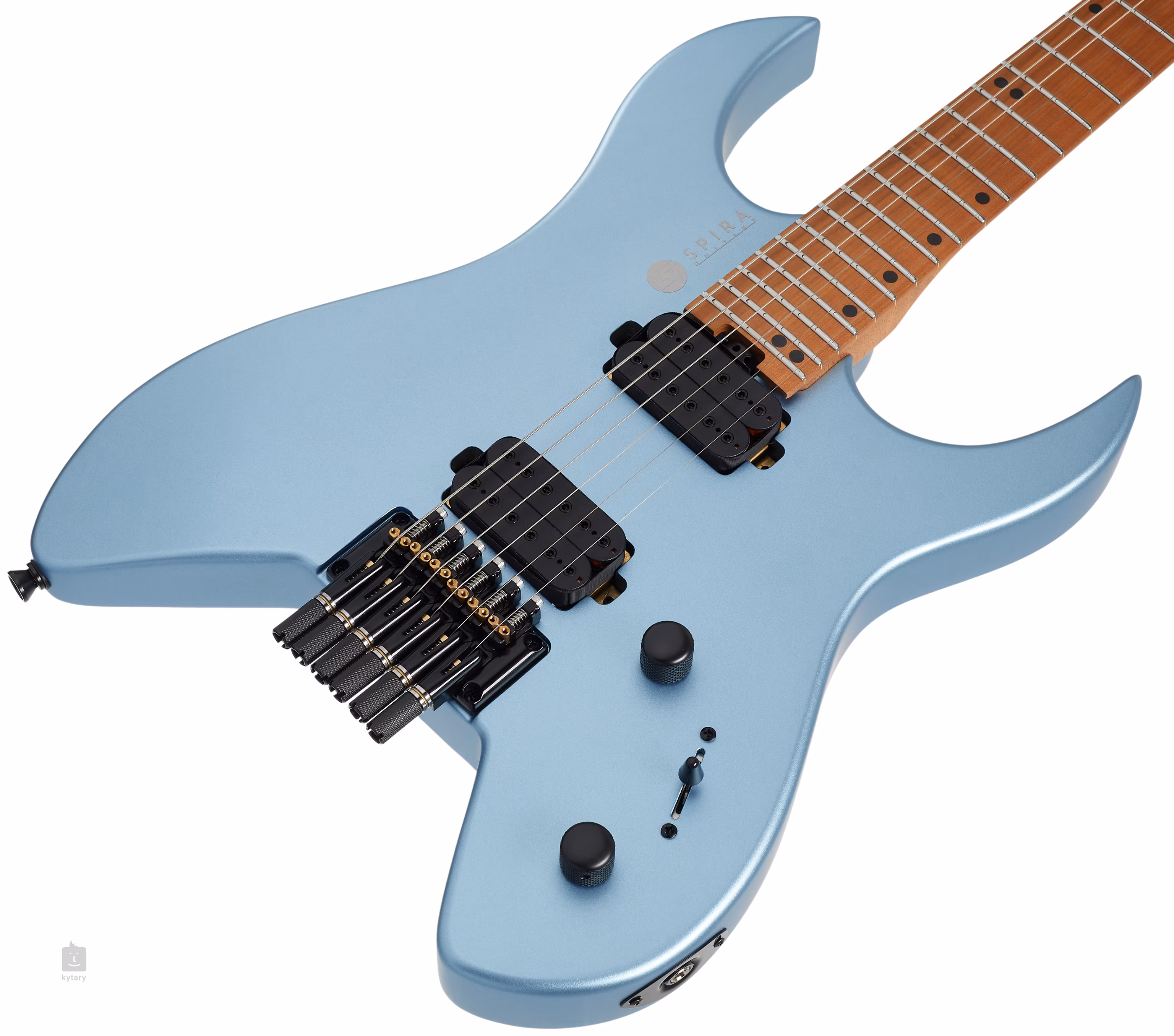 Dva firemní humbuckery Spira Villain s keramickými magnety a silnějším výstupem poskytují kytaře šťavnatý zvuk, který zvláště oceníte v high-gain nastavení. S nastavením zvuku lze pracovat pomocí standardních ovladačů. Struny jsou uchyceny v mechanikách specificky navržených pro headless kytary. Stylové zpracování podtrhuje matný lak a černý hardware.