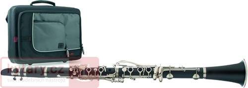 B klarinet systém Böhm, 17 klapek, 6 brýlových kroužků, plastové tělo a ozvučník, niklovaná mechanika. S luxusním lehkým nylonovým nepromokavým pouzdrem s vnější i vnitřní kapsou, měkce vyloženým vnitřkem, popruhy a uchem. Barva černá/šedá, rozměry 385 x 280 x 140mm.