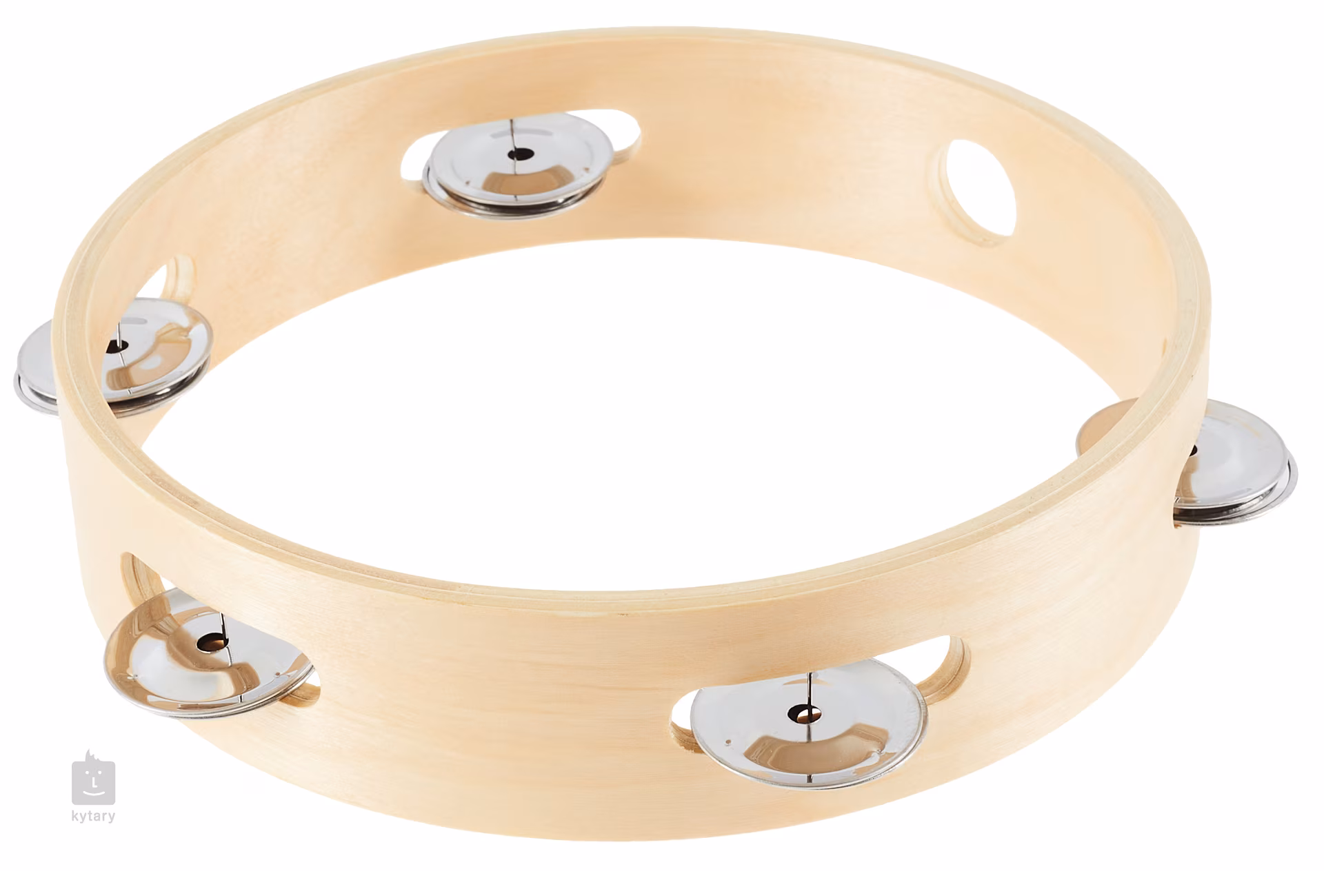 Tamburína o průměru 8", dřevěný březový rám, 1 řada nerezových plíšků.