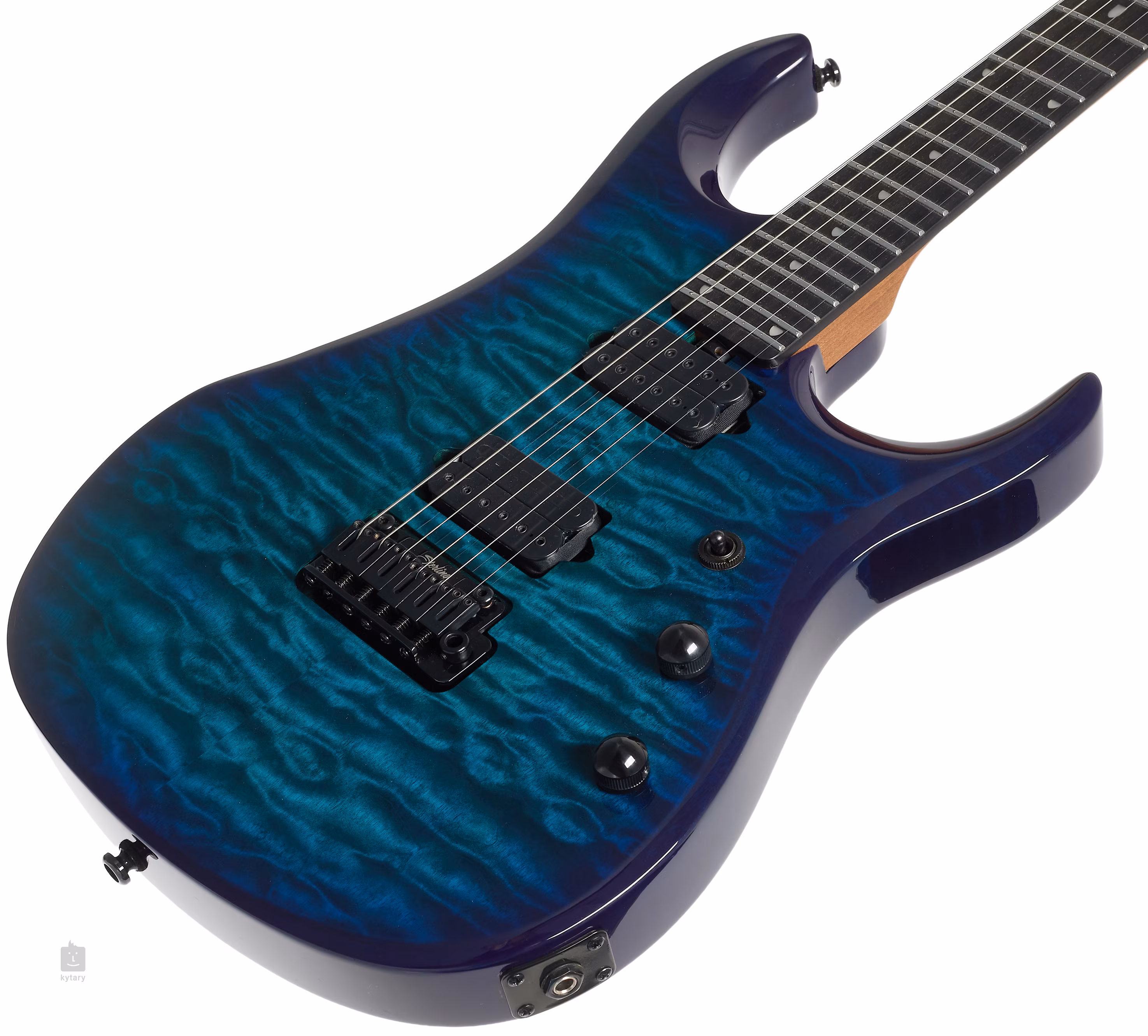 Struny jsou uchyceny ve firemních uzamykatelných mechanikách a moderním tremolu. Pěkné zpracování podtrhuje JP Shield inlay na prvním pražci.