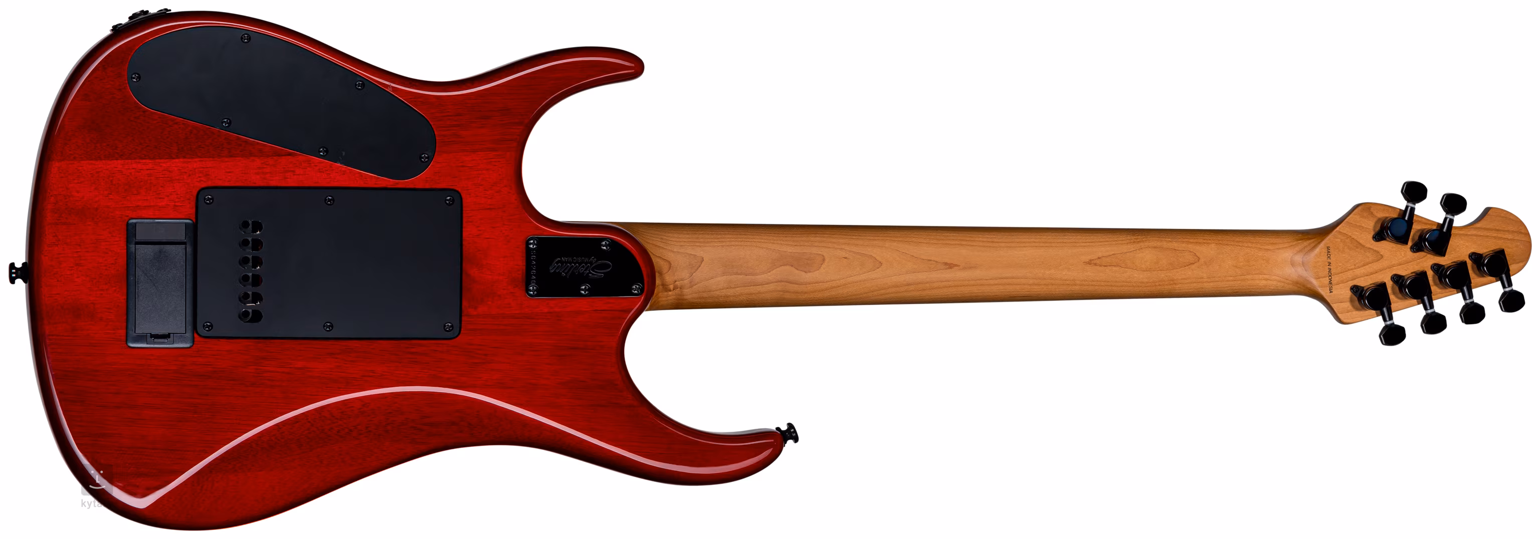 Struny jsou uchyceny ve firemních uzamykatelných mechanikách a moderním tremolu. Pěkné zpracování podtrhuje JP Shield inlay na prvním pražci.