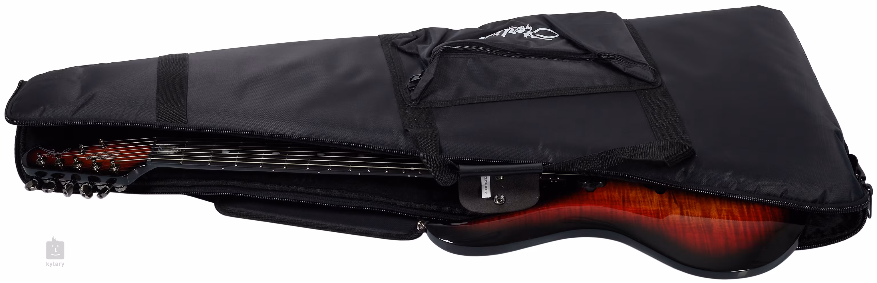 Struny jsou uchyceny ve firemních uzamykatelných mechanikách a moderním tremolu. Pěkné zpracování podtrhuje JP Shield inlay na prvním pražci.
