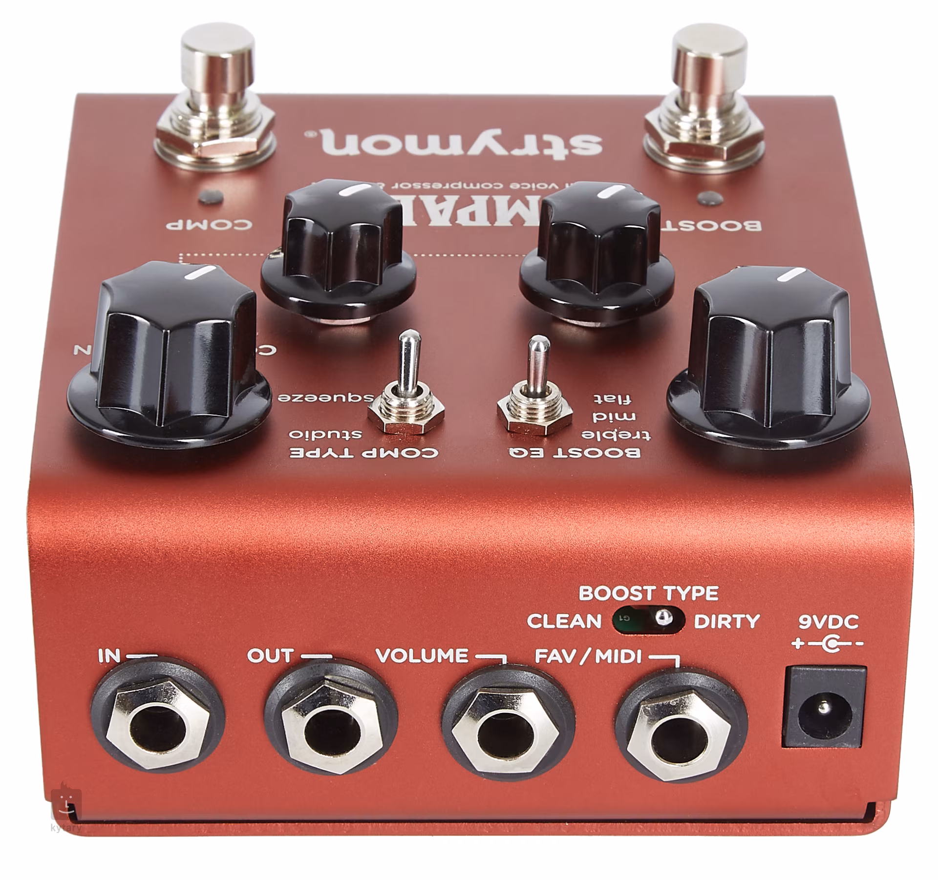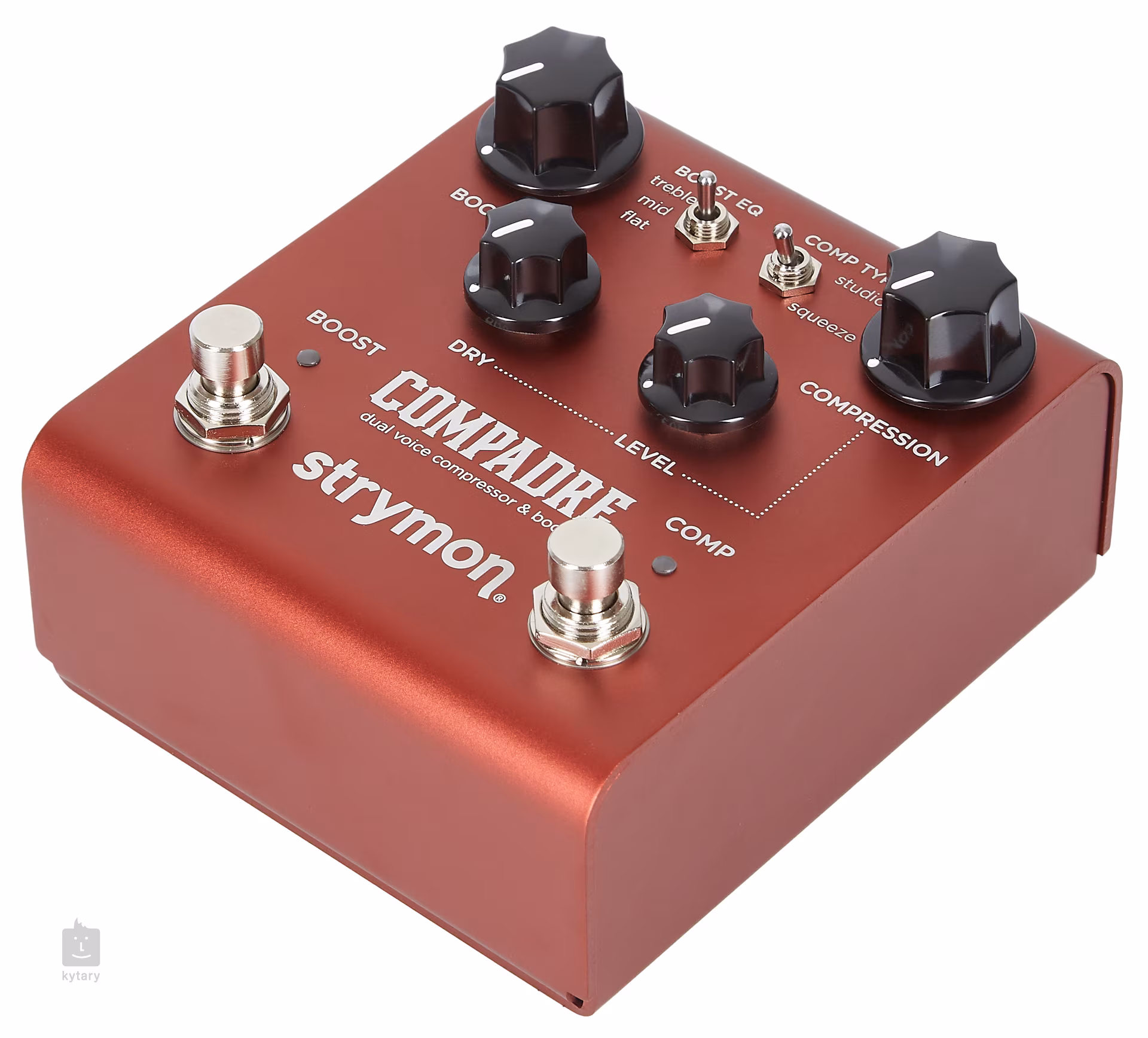 Krabička nabízí dva typy komprese - režim Studio poskytne vašemu zvuku vřelou transparentní kompresi rackových zařízení v nahrávacích studiích, pro větší kompresi s maximálním sustainem je ideální druhý mod Squeeze. Auto makeup gain a auto threshold rovná se o starost míň – vše co k nastavení komprese potřebujete je nastavení ovladače Compression a určení množství čistého signálu knobem Dry (paralelní komprese). Analogová sekce boosteru rovněž nabízí dvě nastavení – čisté zesílení signálu (clean boost) a dirty boost s jemným clippingem známým z pedálů overdrive. Třípolohovým přepínačem Boost EQ (treble, mid, flat) upravíte charakter zvuku tak, aby vždy vynikl, ať už používáte jakoukoliv kombinaci snímačů a zesilovače. Ovladačem Level (-6db až +6dB) optimalizujete výstupní signál pedálového efektu se zbytkem rigu.