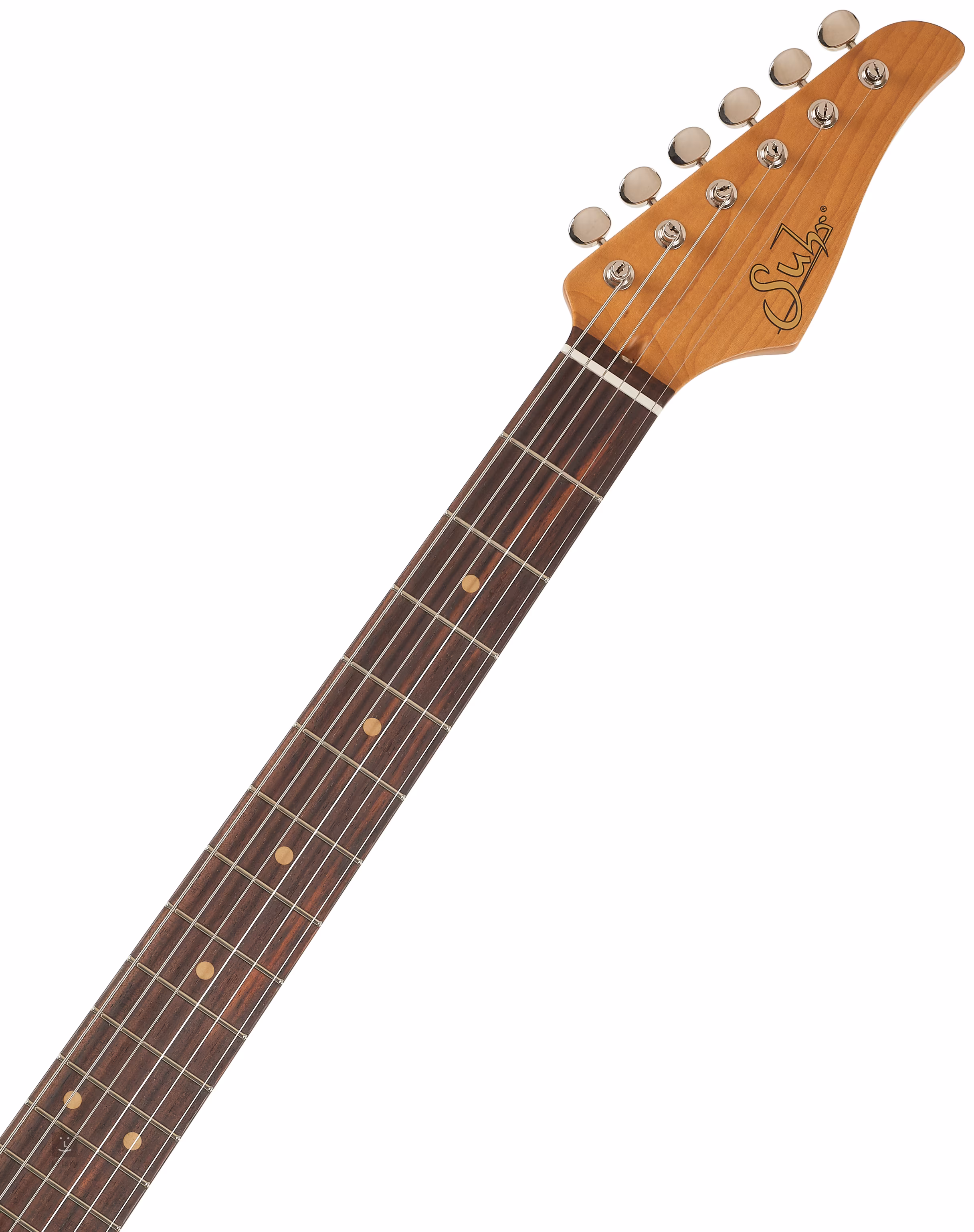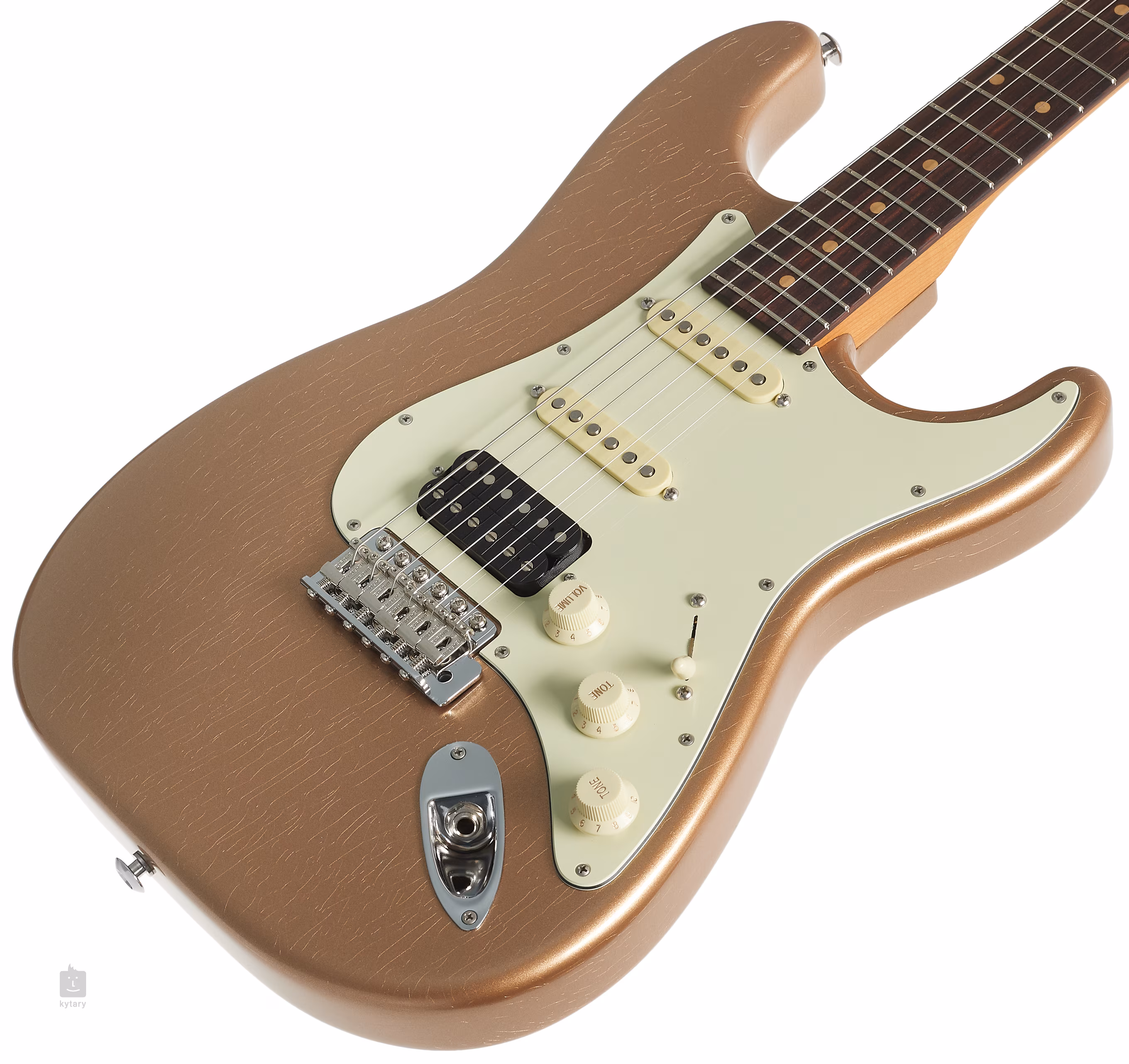 Suhr Classic S Vintage LE, Firemist Gold, HSS je elektrická kytara z limitované řady Classic S Vintage Classic. Nabízí tělo ze tří kusů olše kryté lakem s naprosto decentními prvky postaření/light aging. Ke krku z pečeného javoru s profilem 60's C Vintage Standard (.810"-.930") je přilepen palisandrový hmatník osazený niklovými pražci (Medium Nickel .055"x.090"). Složený rádius hmatníku (9-12 palců) zaručuje skvělé herní vlastnosti a dohmat na celé ploše hmatníku.