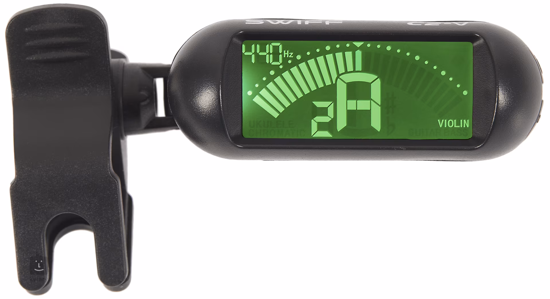 Swiff C2-V je klipová ladička speciálně navržená k ladění houslí. Její systém uchycení je přizpůsobený houslové hlavě, takže bude na vašem nástroji skvěle držet. Ladička má přehledný široký displej a disponuje flexibilním kloubovým mechanismem, který vám umožní natočit displej do libovolného směru. Naladí tóny v rozsahu A0-C8 a poskytuje nastavitelnou frekvenci ladění 410-490 Hz. Napájení pomocí baterie CR2032.