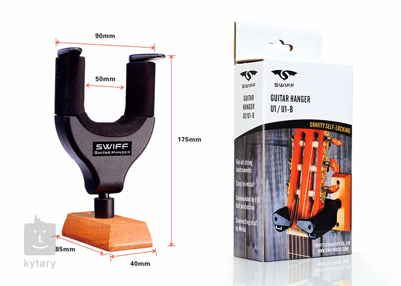 Kytarový věšák Swiff U1 nabízí perfektní řešení pro zavěšení vašeho nástroje. Disponuje ochrannými zámky, které se při vložení nástroje automaticky zavřou a zabrání tak jeho pádu a případnému poškození. Otočná hlava věšáku se přizpůsobí různorodým tvarům kytarových hlav i jiným nástrojům, takže spolehlivě udrží akustiku, klasiku, elektriku, baskytaru, mandolínu nebo například banjo. Všechny části věšáku, které se dotýkají nástroje, jsou vystlané měkkou pěnou, takže se nemusíte obávat poškrábání. Tento model má bytelnou dřevěnou základnu, která bude skvěle vynikat v jakémkoliv interiéru.