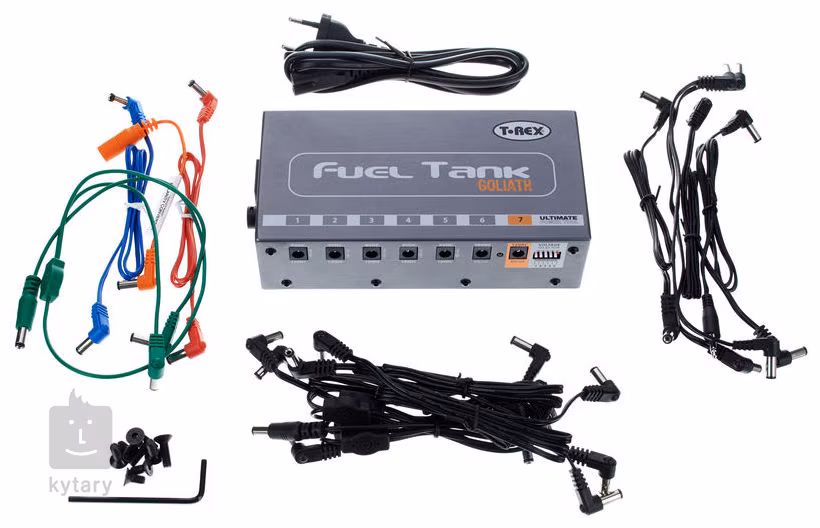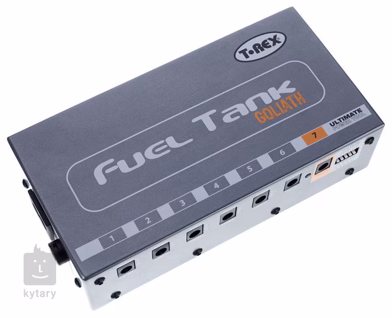 Multiadaptér FuelTank Goliath představuje flexibilní řešení pro pedalboardy s efekty vyžadujícími různé napětí i napájení. Nabízí sedm izolovaných sekcí (5x 9/12V DC/450 mA, 1x 12V AC/450 mA, 1x 18V DC/250 mA) a možnost nastavit vstupní napětí 115/230V. Pojistka je externí pro snadnou výměnu.