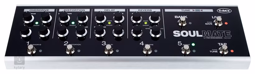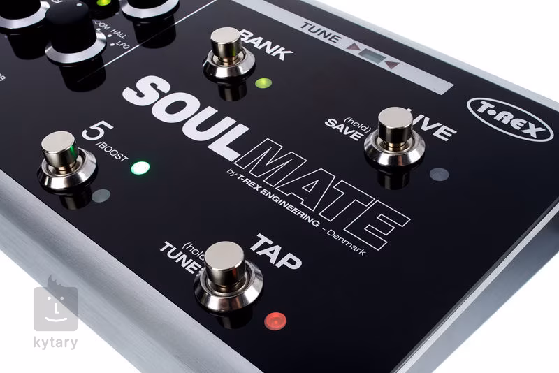 Soulmate je multiefekt obsahující pět efektů založených na populárních modelech firmy T-Rex (Moller, Mudhoney, Replica/Reptile a Room Mate). K dispozici je overdrive, distortion, delay, reverb a booster. Efekty lze používat samostatně nebo jejich libovolnou kombinaci uložit k rychlému vyvolání pomocí deseti presetů. Samozřejmostí je integrovaná ladička a pedál Tap Tempo, kterým přizpůsobíte rychlost efektů tempu vašeho doprovodu. Pro náročné nechybí efektová smyčka a stereo výstup.
