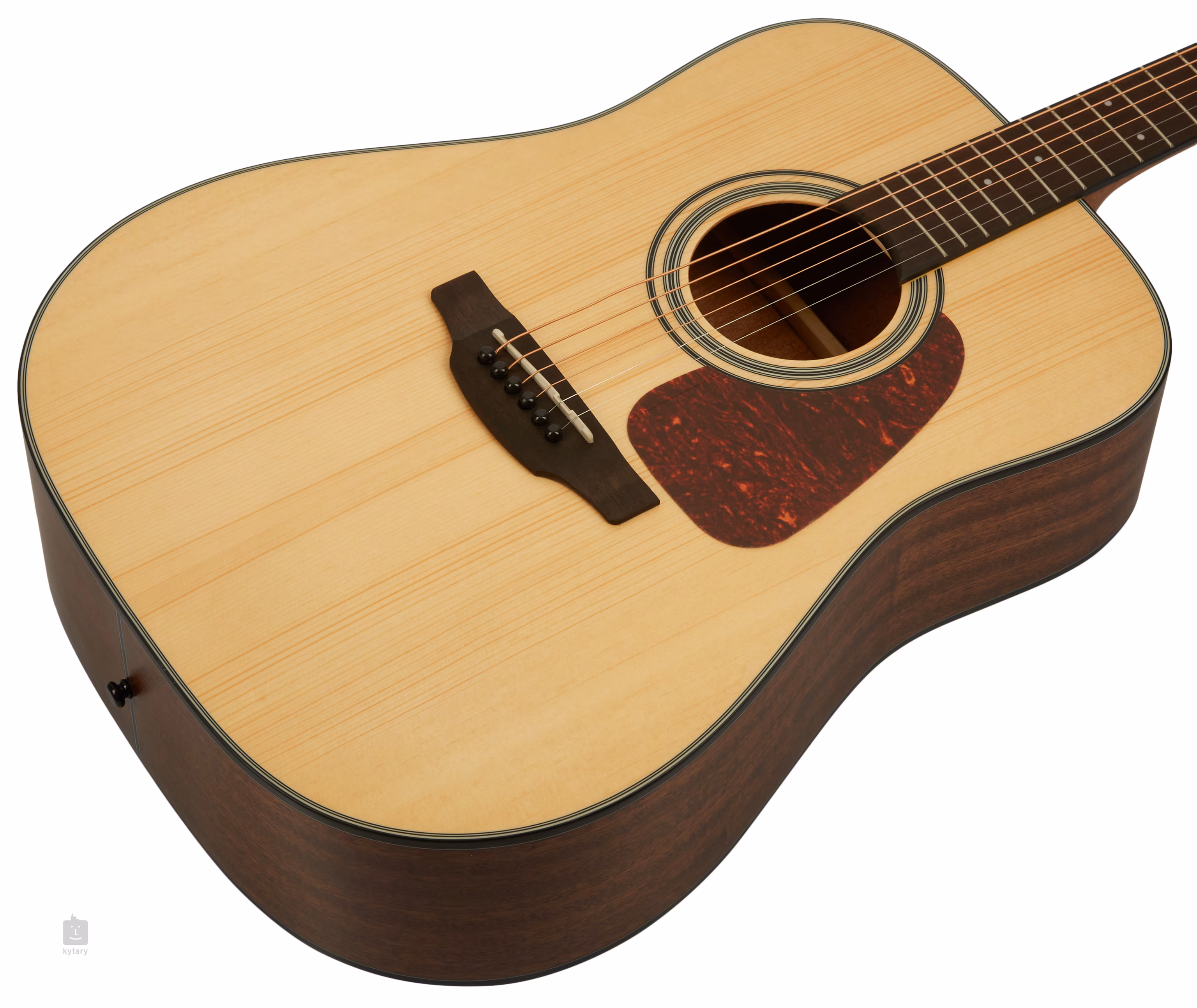 Struny jsou přes nultý a sedlový pražec ze syntetické kosti uchyceny v chromovaných die-cast ladících mechanikách a kobylce bez kolíčků (pin-less bridge), která vám umožní rychlou a snadnou výměnu strun. Stylový vzhled kytary podtrhuje rozeta, praktický pickguard, poziční tečky na hmatníku z imitace perleti a firemní logo na hlavici nástroje.