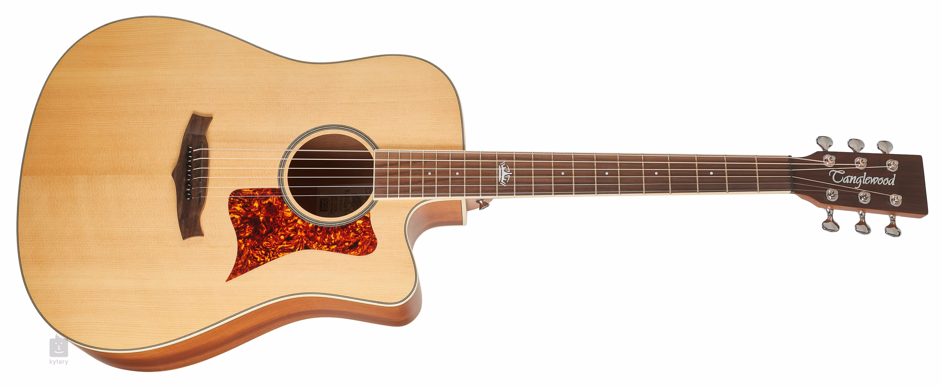 Tanglewood TSP 15 CE z řady Premier Series je elektroakustická kytara s klasickým westernovým tělem Dreadnought. Přední deska kytary je zhotovena z ručně vybraného kusu smrku Sitka, který na zadní desce a lubech doplňuje vrstvený mahagon. K rovněž mahagonovému krku je přilepen hmatník z moderního kompozitního materiálu osazený dvaceti pražci. Orientaci po ploše hmatníku usnadňují perleťové poziční tečky (MOP) a výrazný perleťový inlay na dvanáctém pražci.